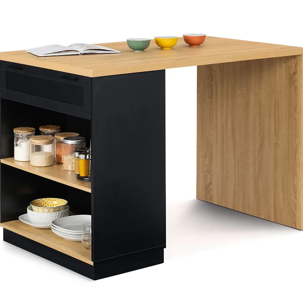 Optimisez et organisez l’espace de votre cuisine grâce à notre îlot central mange-debout VITO avec rangements intégrés au coloris bois noir et imitation hêtre !Le look tendance de cet îlot central, ses lignes droites et épurées et ses couleurs sobres tout en contraste lui permettent de s’adapter idéalement à tout type d’intérieur ! Il conférera un aspect net et rangé à votre cuisine !Son format généreux et néanmoins compact, peu encombrant, facilite la circulation tout en évitant les pas inutiles au quotidien dans votre pièce de vie. Il structure l’espace de votre cuisine ! Parfait pour les pièces de vie ouvertes et aérées.Avec son grand plateau épais (PB épaisseur 3 cm) aspect bois, cette table de bar vous offrira un plan de travail supplémentaire pour cuisiner. Son plateau de 130 cm de long permet de glisser en-dessous des tabourets de bar et accueillir ainsi jusqu’à 4 personnes ! Ultra fonctionnel ce meuble de bar comporte de nombreux rangements. Son grand tiroir avec encadrement permettra d’entreposer vos papiers, couverts et ustensiles de cuisine tandis que ses 2 étagères seront parfaites pour garder à portée de main condiments, verres ou encore bocaux. De quoi optimiser au maximum votre espace !Sa structure robuste en PB (panneaux de particules de bois, épaisseur 1,5 cm) lui assure stabilité et robustesse pour un usage au quotidien !Optez sans tarder pour cet îlot tendance et convivial à la fois fonctionnel et décoratif !Dimensions de l’îlot central mange-debout VITODimensions globales : Longueur 130 cm x largeur 80 cm x Hauteur 90,5 cmDimensions intérieures du tiroir : L. 69,5 x l. 33,5 x H. 14 cmDimensions des étagères : L. 75 x l. 37 x H. 29,5 cmDimensions façade du tiroir : L. 74,5 x H. 18 cmÉpaisseur plan de travail : 3 cmMatériaux : Particules de bois (PB) À monter soi-mêmeProduit vendu seul, sans les tabouretsModèle également disponible en coloris gris et blanc, blanc et béton et blanc et bois !Retrouvez l’ensemble de nos meubles de cuisine sur notre bo