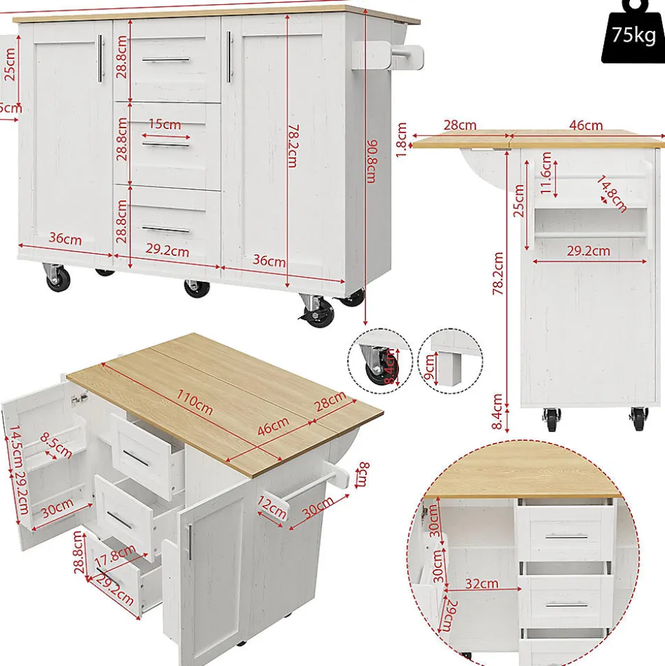 Taille de l’emballageQuantité par paquet : 1122,56 * 53,85 * 13,97 cm 27,15 kgPackage Quantity : 190,81 * 47,63 * 19,05 cm 25,55 kg DescriptionDétails du produitDimensions du produit Dimensions totales en utilisation comme îlot de cuisine : 135 x 46-74 x 86,6 cm (L x l x H)Dimensions totales en utilisation comme armoire : 135 x 46-74 x 87,2 cm (L x l x H)Poids du produit 48,7 kgMatériau Métal, MDFPoids supporté 60 kgMontage requis 30 minutesContenu de la livraison Un îlot de cuisine, pièces pour le montageNombre de colis 2Pays d’origine Chine