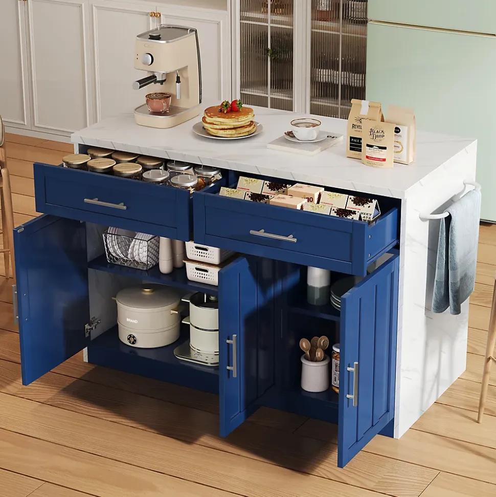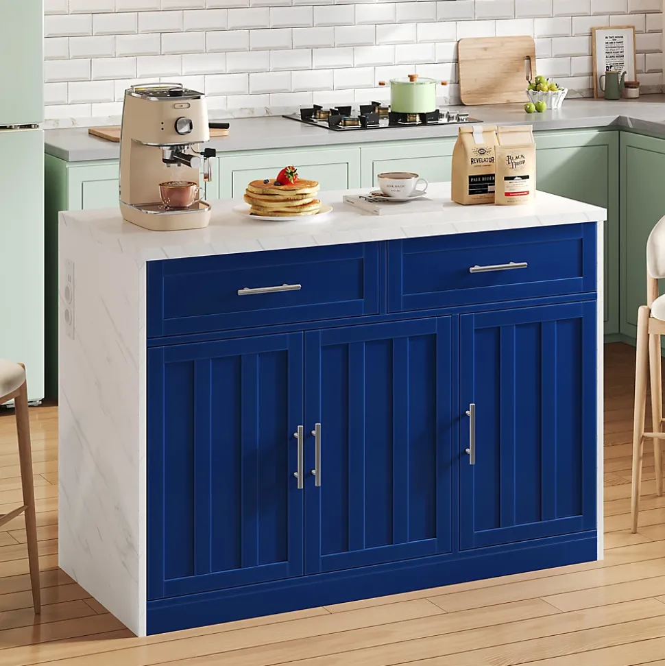 ▶ ▶ Détails ▶────────────────● Type de produit : Îlot de cuisine● Matériau : MDF● Couleur : Blanc+Bleu● Dimensions du produit : 120 × 60 × 91 cm (L × P × H)● Poids du produit : 46,85 kg● Temps de montage estimé : 40–80 minutes● Style du produit : Européen● Montage requis : Oui● Origine : Chine● Nombre de colis : 2► Remarques ►※ Nettoyer avec un chiffon doux et sec.※ Les ferrures peuvent se desserrer avec le temps; vérifier régulièrement que toutes les connexions sont bien serrées.
