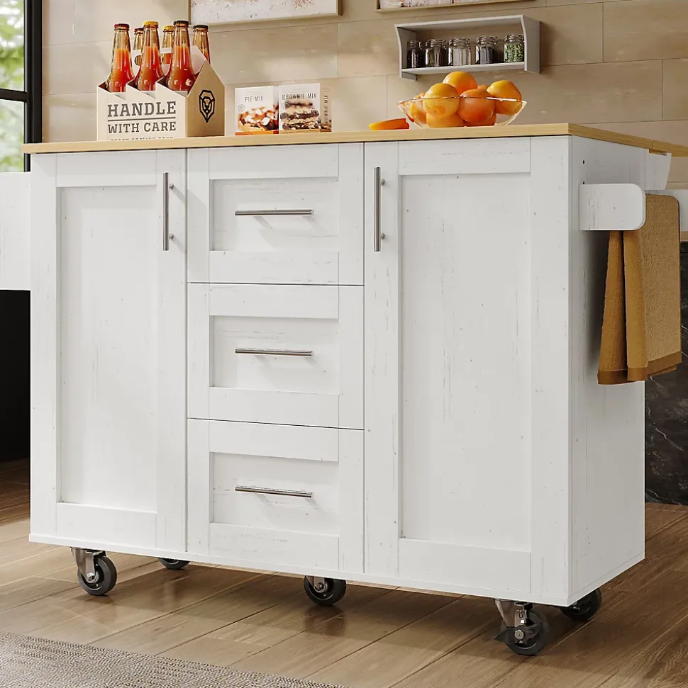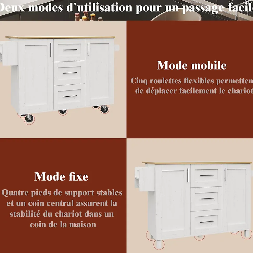 Caractéristiques du produit1.Ce chariot de cuisine est doté de panneaux latéraux rabattables qui se déplient pour former une table à manger de 74 cm de long.2.Le plateau est en bois massif de haute qualité avec une finition veinée. Ce matériau durable résiste à l’usure quotidienne, ce qui en fait une surface de travail idéale pour couper les légumes, préparer les aliments et réaliser d’autres tâches culinaires. Les tiroirs sont équipés d’élégantes poignées ergonomiques en alliage de zinc pour une ouverture facile et pratique.3.Le chariot est équipé de cinq roulettes avec freins pour une maniabilité optimale et une stabilité parfaite à l’arrêt.4.Trois tiroirs spacieux offrent un grand espace de rangement pour les petits objets ou effets personnels. Leur conception assure un accès facile tout en préservant une apparence soignée et ordonnée. Un porte-snacks est astucieusement intégré aux portes des placards pour ranger les en-cas, les flacons de condiments et autres petits articles.5.De plus, un porte-serviettes pratique est inclus pour suspendre les torchons, les essuie-mains ou autres textiles.Détails du produit :1.Dimensions dépliées : 135 x 46-74 x 86,6 cm (L x l x H)2.Dimensions pliées : 135 x 46-74 x 87,2 cm (L x l x H)3.Poids du produit : 48,7 kg4.Matériaux : Métal, panneaux de fibres de moyenne densité (MDF)5.Charge maximale supportée : 60 kg6.Temps de montage : 30 minutes7.Contenu de l’emballage : Un îlot de cuisine, accessoires de montage8.Quantité : 29.Pays d’origine : Chine