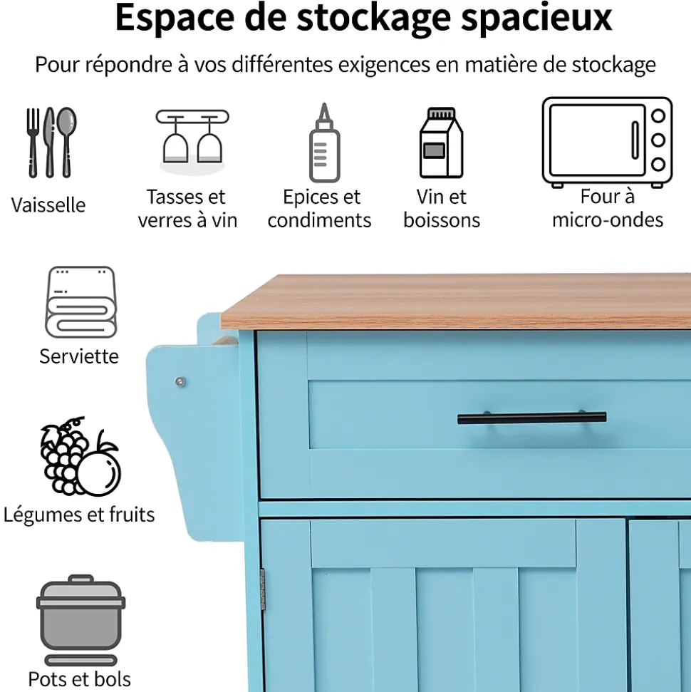 ▶ ▶ Détails ▶────────────────● Type de produit : Chariot de cuisine● Dimensions : L 129 x P 71 x H 91,5 cm● Matériau : Panneau de particules● Couleur : Bleu● Nombre de tiroirs : 2● Nombre de roulettes : 4● Nombre de pieds en bois massif : 5● Porte-serviettes : 1● Capacité de la tablette : 40 kg● Capacité de la tablette rabattable : 10 kg● Capacité du rayon : 20 kg● Capacité du tiroir : 10 kg● Nombre recommandé de personnes : 2● Temps de montage : 40-80 minutes● Nombre de colis : 2► Remarques ►※ Ce produit est livré en 2 colis. Ils peuvent ne pas arriver en même temps. Merci de patienter.※ En raison des mesures manuelles, une tolérance de 2-3 cm peut se produire.※ En raison des conditions d’éclairage, la couleur réelle peut différer légèrement de l’image du produit. Veuillez vous référer au produit reçu.※ Si vous avez des questions pendant l’installation, veuillez nous contacter dès que possible.