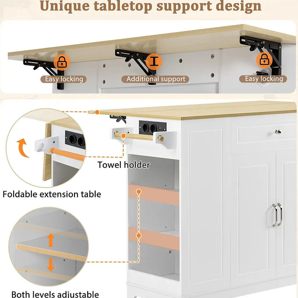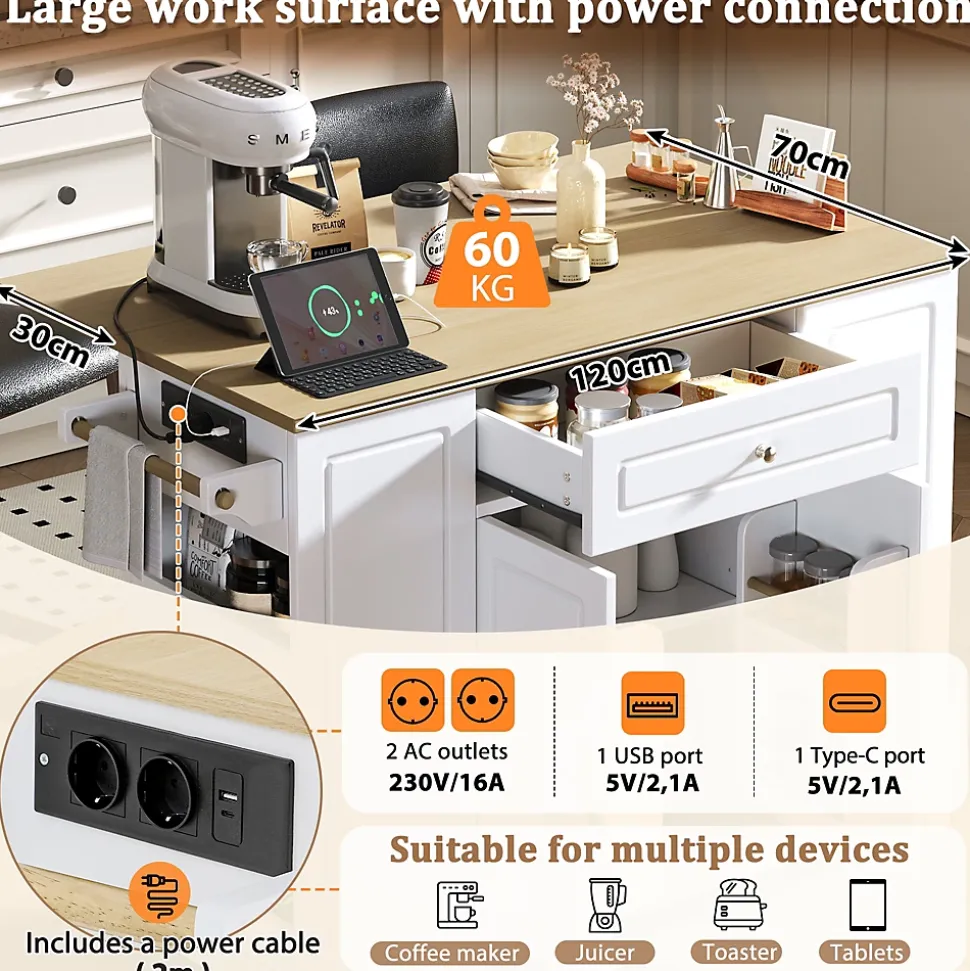 - 【Plan de Travail Extensible】 Tablette rabattable offrant un espace supplémentaire pour la préparation ou les snacks, intégrant prises électriques, USB et USB-C pour utiliser appareils de cuisine ou recharger vos gadgets facilement.