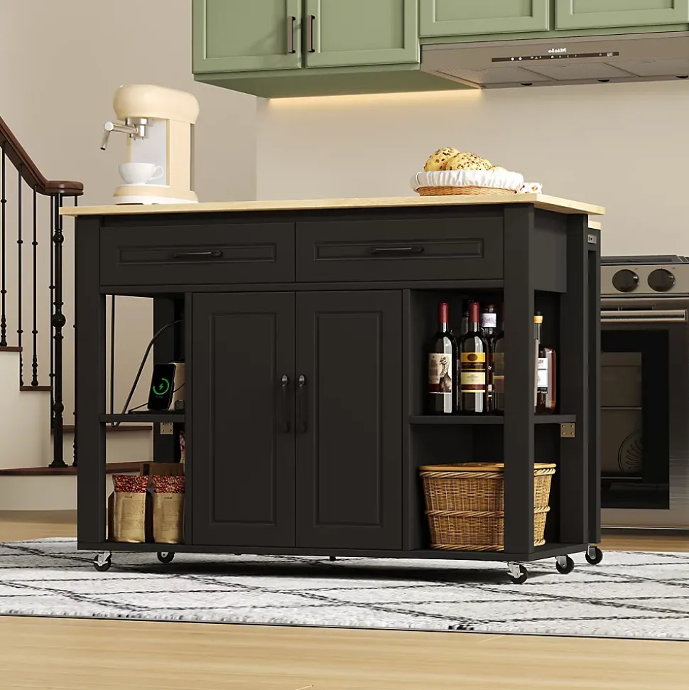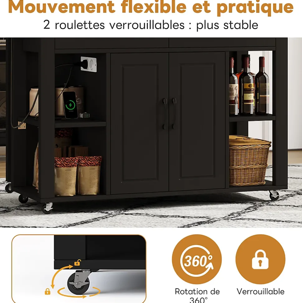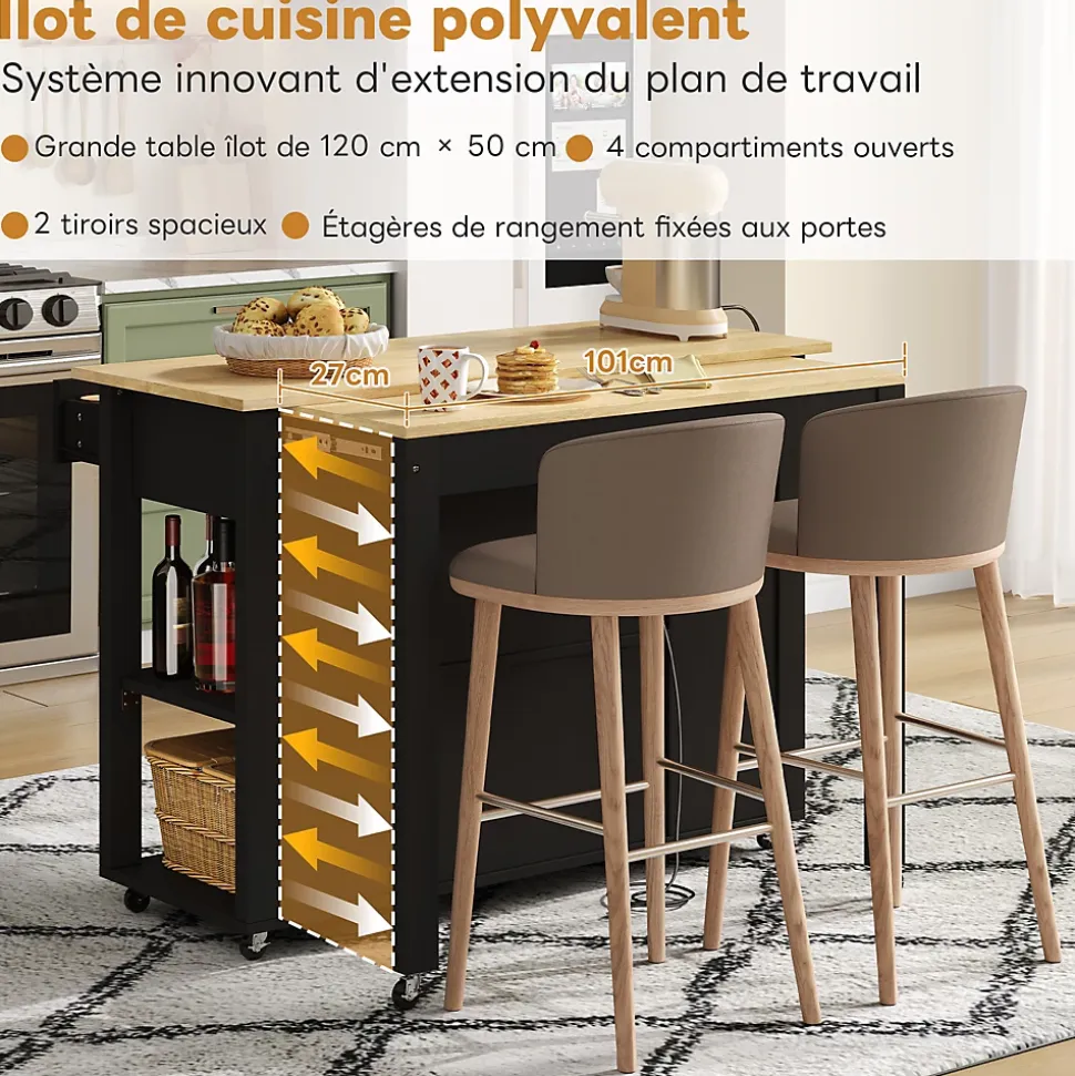 ▶ ▶ Détails ▶────────────────● Type de produit : Îlot de cuisine● Matériau : MDF● Couleur : Noir + Naturel● Pièces adaptées : Cuisine, salle à manger, salon● Dimensions totales : 120 × 77 × 93 cm● Poids net : 50 kg● Plan de travail : 120 × 50 cm● Barre de comptoir / Table extensible : 110 × 27 cm● Prises électriques : 2 × AC + 2 × USB● Tiroirs : 2● Portes d’armoire avec étagères de porte : 2● Compartiments de rangement ouverts : 4● Mobilité : Roulettes (2 avec frein)● Montage requis : Oui● Nombre de colis : 2► Remarques ►※ La couleur réelle du produit peut légèrement différer de l’image en raison de l’éclairage ou de l’affichage.※ De légères variations peuvent survenir en raison de la mesure manuelle.※ Ce produit est livré en 2 colis.※ Si vous avez des questions lors de l’installation, veuillez contacter notre service client.