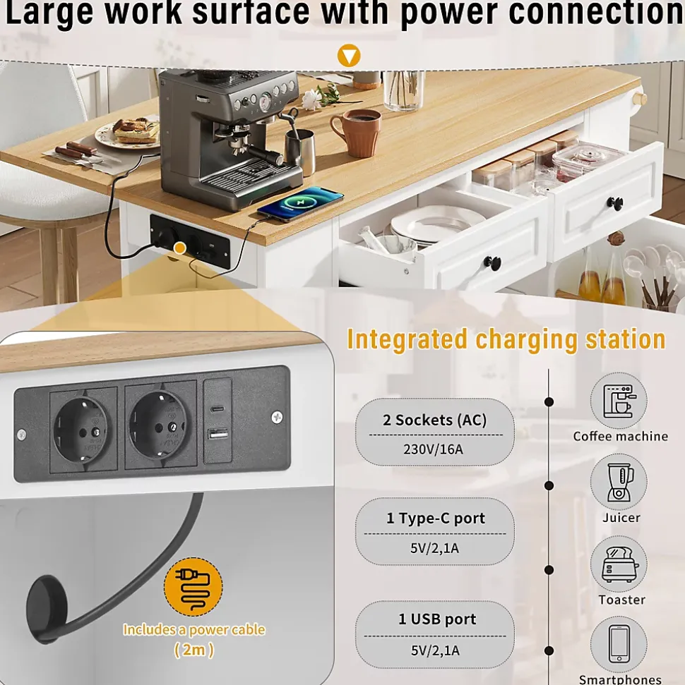 - 【Cuisine connectée】 Prises intégrées et ports USB et USB-C permettent d’alimenter petits appareils et de recharger téléphones ou tablettes à portée de main, pour un usage fluide et moderne.