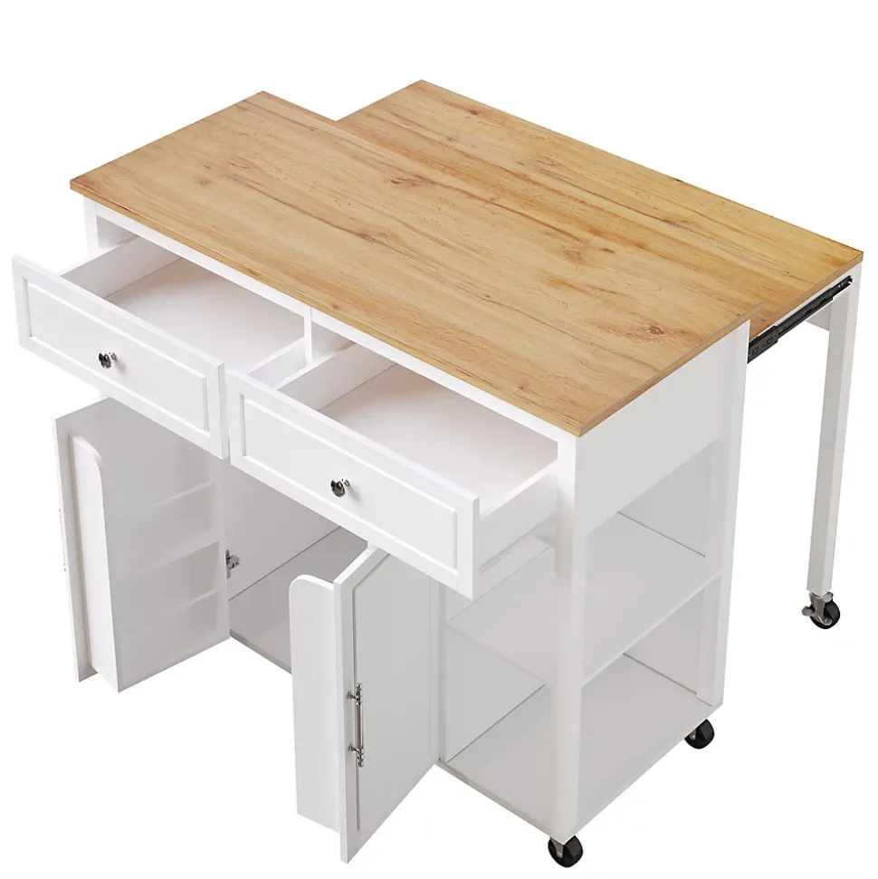 - 【Rangement polyvalent】 L’îlot propose deux tiroirs spacieux et des étagères latérales réglables à trois niveaux, accompagnés de rangements intégrés aux portes, pour organiser facilement ustensiles, vaisselle et aliments de différentes tailles.