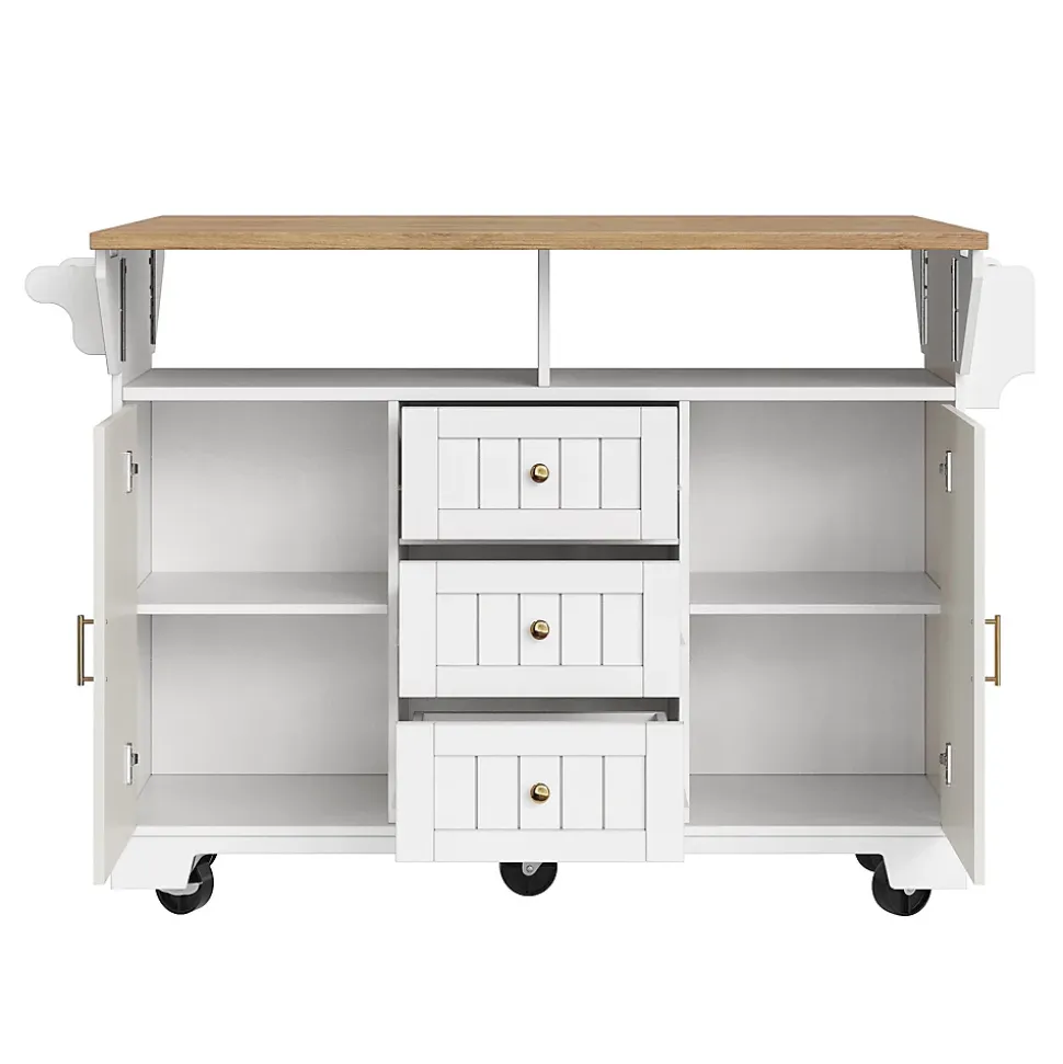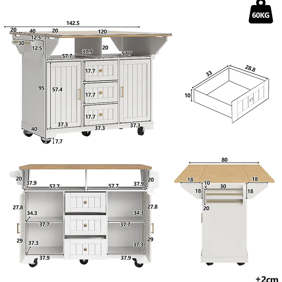 - 【Taille ajustable par clapet】 La table rabattable sur les deux côtés double la surface utilisable, permettant d’utiliser l’îlot comme espace de préparation ou table à manger, s’adaptant aux besoins changeants de la cuisine et des repas partagés.