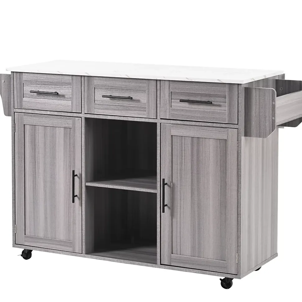 ▶ ▶ Détails ▶────────────────● Nom du produit : Îlot de Cuisine● Couleur : Gris● Dimensions : 120 × 71 × 91,5 cm● Matériau : Panneau de particules● Nombre de tiroirs : 3● Nombre de roulettes : 4● Nombre d’étagères ouvertes : 4● Poids net : 49,2 kg● Poids brut : 54,4 kg● Capacité de la table supérieure : 40 kg● Capacité de la table rabattable : 10 kg● Capacité de l’étagère : 20 kg● Capacité des tiroirs : 10 kg● Nombre recommandé de personnes : 2● Temps estimé de montage : 40-80 minutes● Nombre de colis : 2► Remarques ►※ Ce produit est expédié en 2 colis, qui peuvent arriver séparément. Merci de patienter.※ En raison des mesures manuelles, des écarts de taille de 2 à 3 cm peuvent se produire.※ La couleur réelle peut légèrement différer de l’image en raison de la lumière ou des réglages d’affichage. Veuillez vous référer au produit réel que vous recevez.※ Si vous avez des questions pendant l’installation, veuillez nous contacter dès que possible.