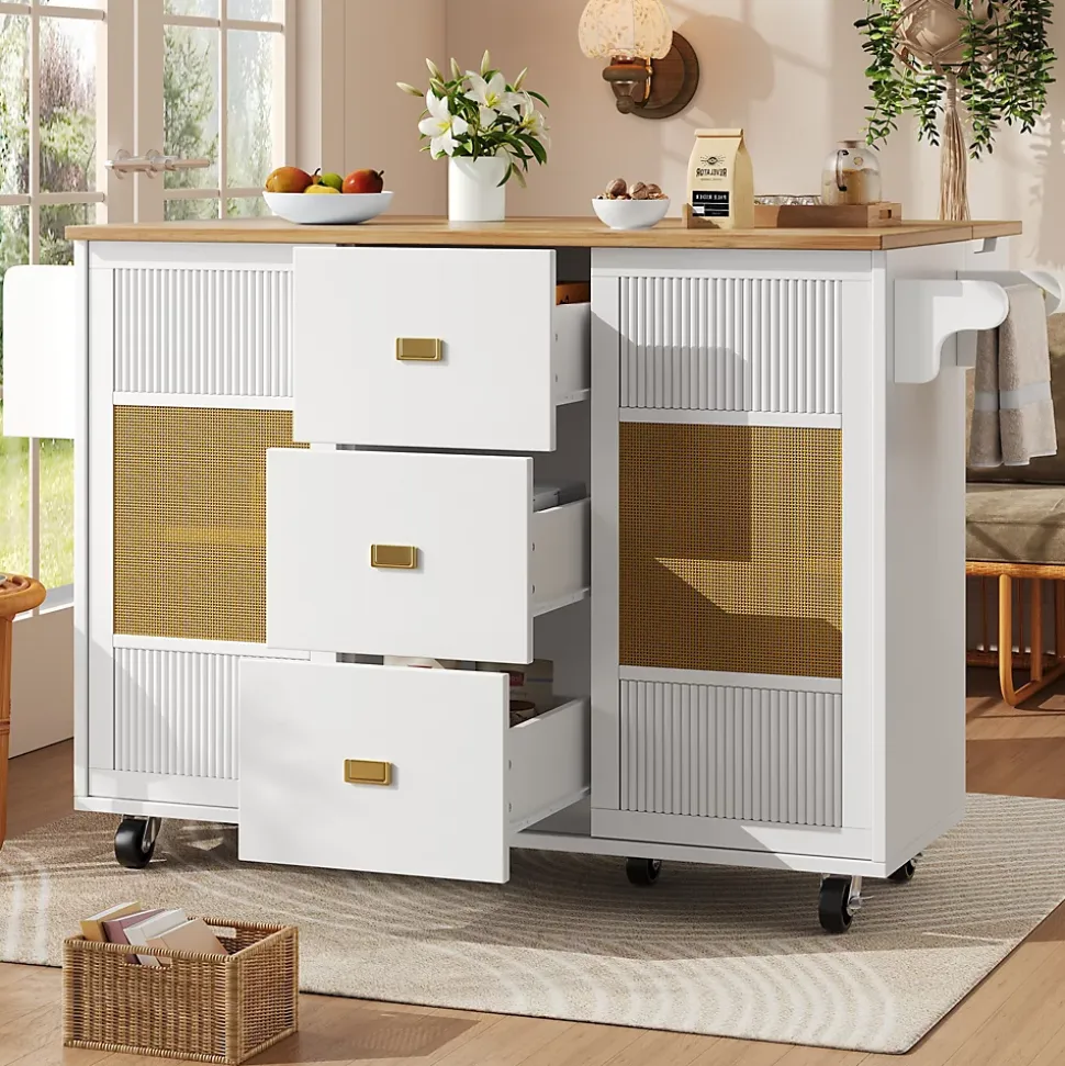 - 【Stockage Polyvalent】 Équipée de tiroirs, de compartiments ouverts, de portes coulissantes et d’étagères réglables, cette île permet une organisation flexible et personnalisable, idéale pour ranger vos ustensiles, épices ou autres objets essentiels.