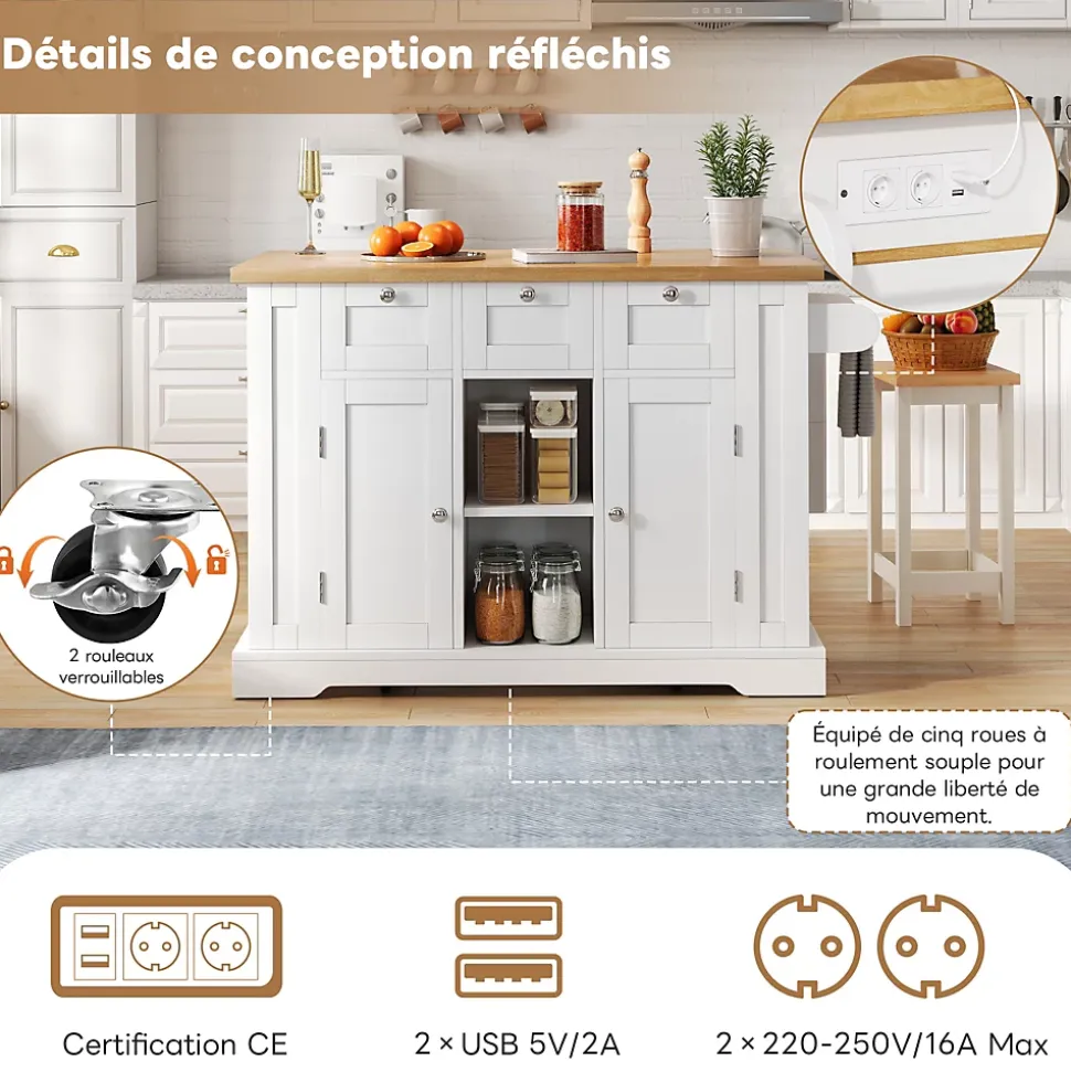 - 【Prise intégrée avec USB】 L’île mobile est équipée d’une prise européenne (2 x 220V-250V/16A Max) et de deux ports USB (5V/2A), permettant de brancher facilement des appareils tels que mixeurs, machines à café ou même charger votre smartphone pendant que vous cuisinez.