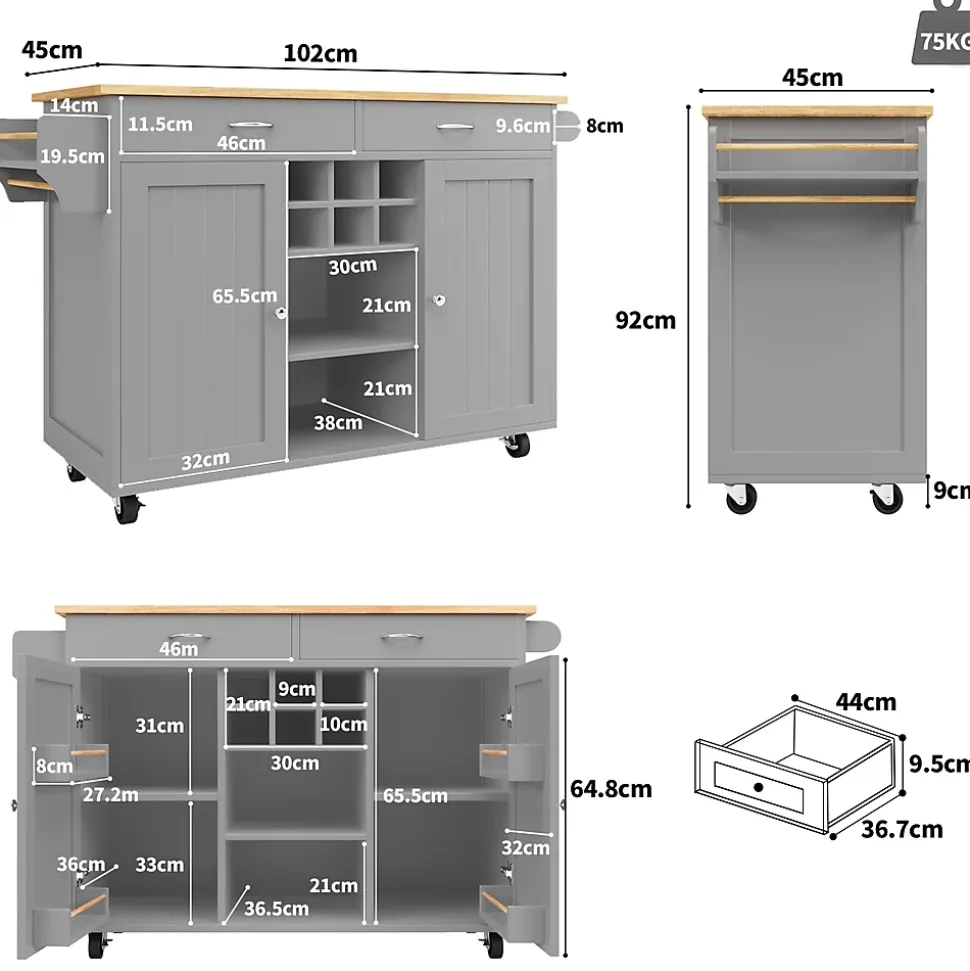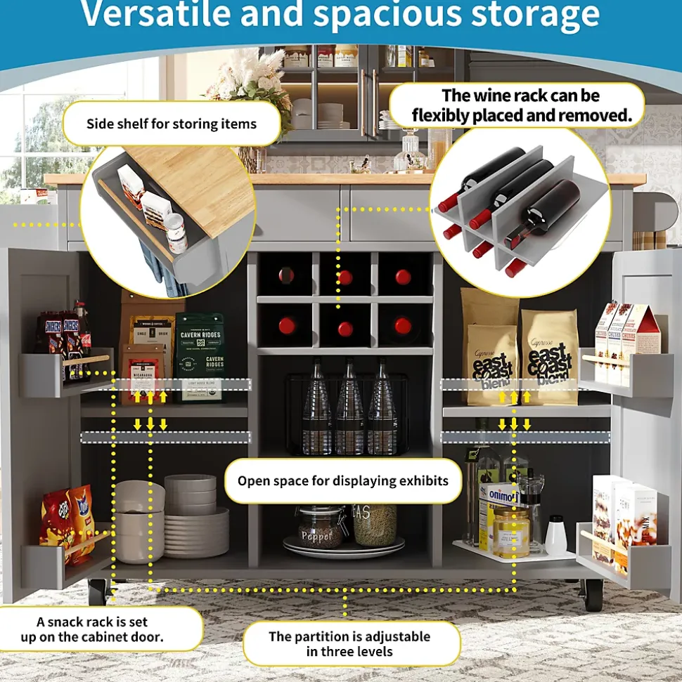- 【Polyvalence d’utilisation】 Que ce soit comme îlot de cuisine, chariot de service ou solution de rangement, ce meuble combine fonctionnalité et style moderne, s’adaptant parfaitement à différents styles et usages au quotidien.