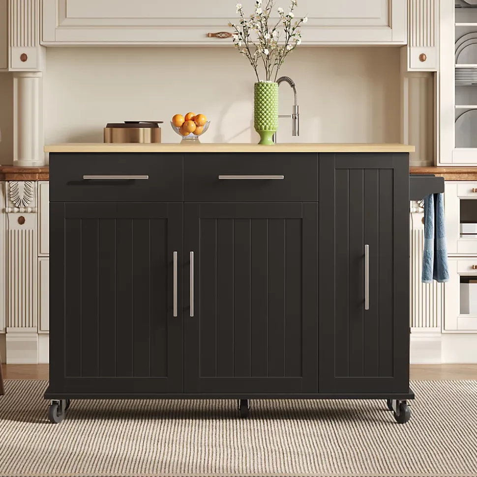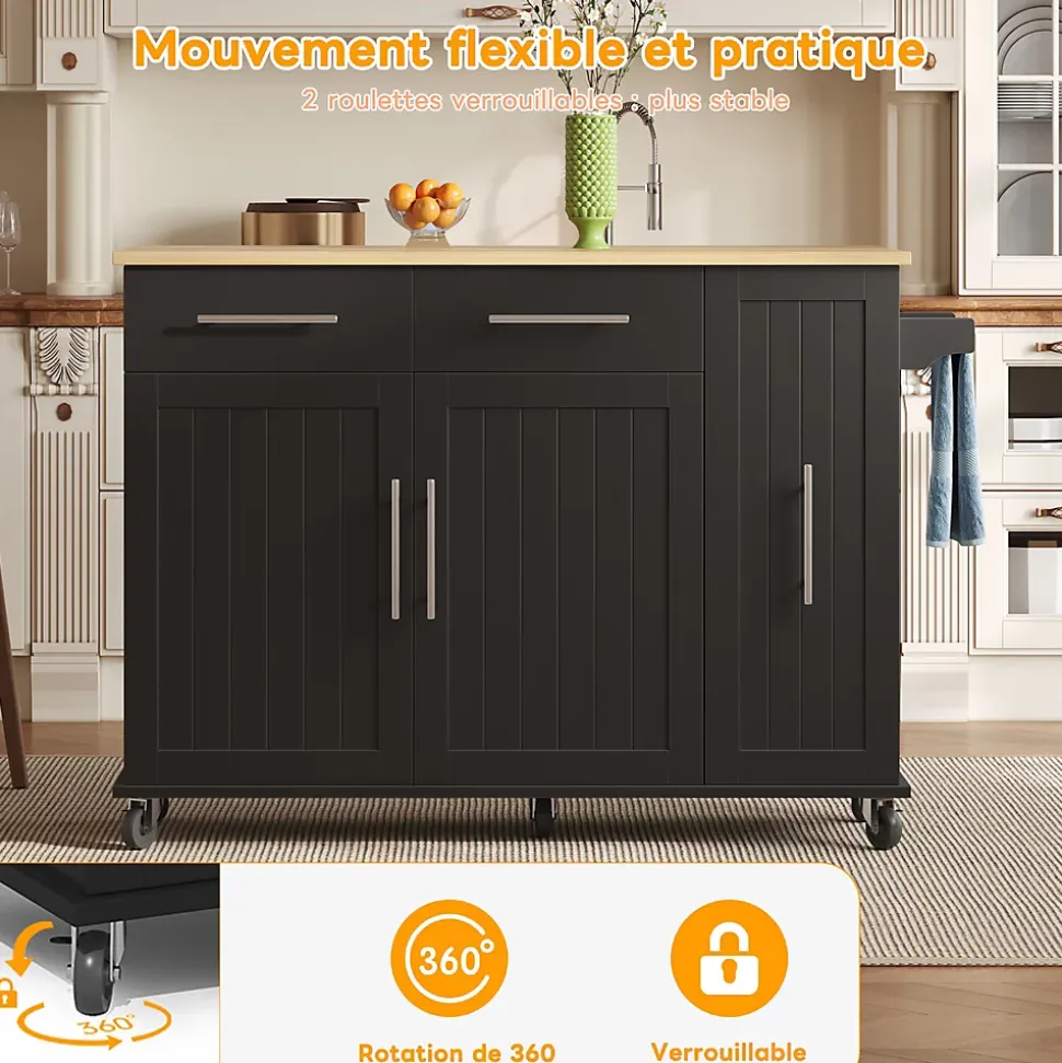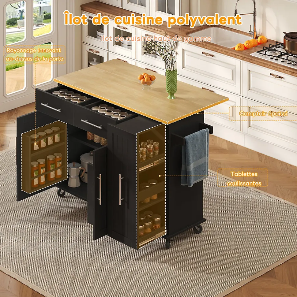 ▶ ▶ Détails ▶────────────────● Type de produit : Îlot de cuisine● Matériau : MDF● Couleur : Noir + Naturel● Pièces adaptées : Cuisine / Salle à manger / Salon● Forme de l’îlot de cuisine : Rectangulaire● Dimensions totales : 120 × 40 (extensible à 65) × 90 cm● Poids net : 51,5 kg● Plan de travail : Avec design Drop-Leaf rabattable● Tiroirs : 2● Étagère coulissante : 3 niveaux (niveau intermédiaire réglable en hauteur)● Étagères internes sur les portes : Oui● Mobilité : 5 roulettes universelles (2 avec frein)● Porte-serviettes : Oui● Montage requis : Oui● Nombre de colis : 2► Remarques ►※ La couleur réelle du produit peut légèrement différer de l’image en raison de l’éclairage ou de l’affichage.※ De légères variations peuvent survenir en raison de la mesure manuelle.※ Ce produit est livré en 2 colis.※ Si vous avez des questions lors de l’installation, veuillez contacter notre service client.