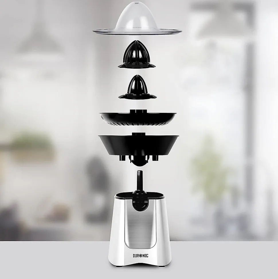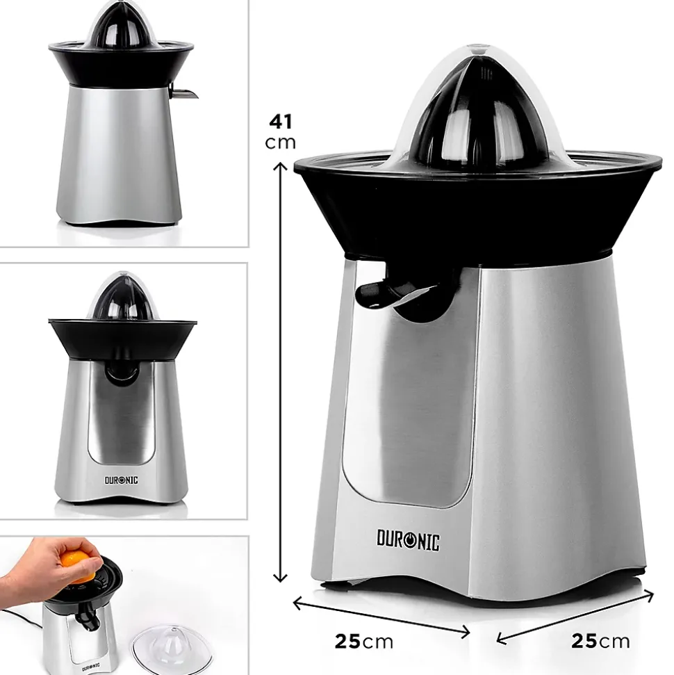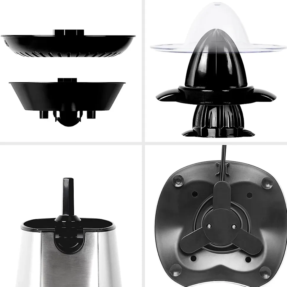 Un moteur puissant de 100W permet de garantir le bon fonctionnement du presse-agrume lors de son utilisation et de prolonger sa durée de vie. Doté d’un interrupteur intelligent, presser délicatement le fruit contre le cône permet d’enclencher le moteur et d’obtenir rapidement et efficacement son jus sans aucun effort. Le bec verseur repliable permet en outre de verser le contenu une fois la quantité souhaitée est pressée et éviter de laisser l’appareil goûter une fois le jus versé.Son tamis récupère la pulpe que vous pouvez au choix décider de jeter ou d’ajouter à moindres mesures dans le jus en fonction des préférences de chacun. La pulpe peut également être utilisée pour en faire des gâteaux ou même des plats. Après utilisation, les différents éléments sont démontables simplement pour un nettoyage aisé et rapide. Le câble d’alimentation s’enroule soigneusement sous l’unité tandis qu’un couvercle est également fourni pour éviter tout dépôt de poussières sur les cônes.Cet appareil est fourni avec deux cônes interchangeables noirs de tailles différentes pour convenir aux agrumes de toutes tailles. Cette variété de fruit est reconnaissable par sa peau dure et non comestible et a pour particularités d’être faible en calories, riche en vitamines C / B1 / B9, minéraux (calcium, magnésium, potassium) et propriétés antioxydantes tout étant bénéfiques pour le cholestérol comme la détoxication du foie et désintoxication du système.Relativement méconnues, de nombreuses autres variétés d’agrumes aux goûts innovants et disponibles en toute saison, permettent également d’être utilisées avec un presse-agrume. Variez les plaisirs en goûtant aux bienfaits des jus d’agrumes extraits de Bergamote, Bigaradier, Calamondin, Cédrat, Citron vert, Chami, Clémentine, Combava, Kumquat, Lime, Limette, Mandarine, Moro, Orange sanguine, Pamplemousse, Pomelo, Sudachi, Tangelo, Tangerine, Yuzu, etc. »