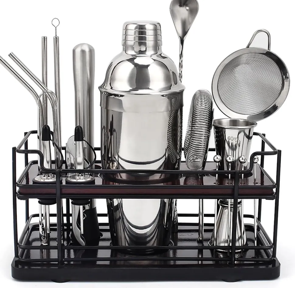 Préparez des cocktails dignes d’un professionnel avec ce kit cocktail complet de 20 pièces comprenant un shaker de 750 ml et tous les accessoires essentiels en acier inoxydable résistants à la rouille. Le support moderne à double étage en fer avec accents en bambou permet de ranger vos outils de manière élégante et pratique. Chaque accessoire est conçu pour durer et est compatible lave-vaisselle pour un usage quotidien ou des occasions spéciales. Le kit inclut un livre de recettes pour réaliser margaritas, martinis et autres cocktails sophistiqués. Présenté dans une boîte élégante, ce set est un cadeau idéal pour les amateurs de cocktails débutants ou expérimentés et permet de transformer chaque fête ou réunion en une expérience de bartending professionnelle.