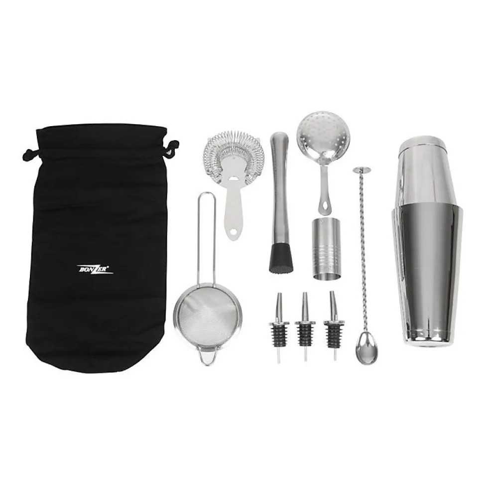 Kit cocktail barman professionnel Kit barman contenant 9 ustensiles essentiels à la réalisation de délicieux cocktails. Le kit comprend : 3 verseurs. Verre Boston. Récipient Boston. Mesure double à alcool 25 / 50ml. Passoire Julep. Passoire Hawthorne. Passoire de bar fine. Pilon à cocktail. Cuillère à cocktail.Marque: Bonzer. Poids: 1.12kg