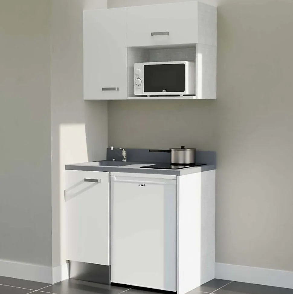 Kitchenette K00 - 100 cm - façades Blanc - Plan monobloc en quartz coloris Cromo évier à gauche - Electroménager Blanc