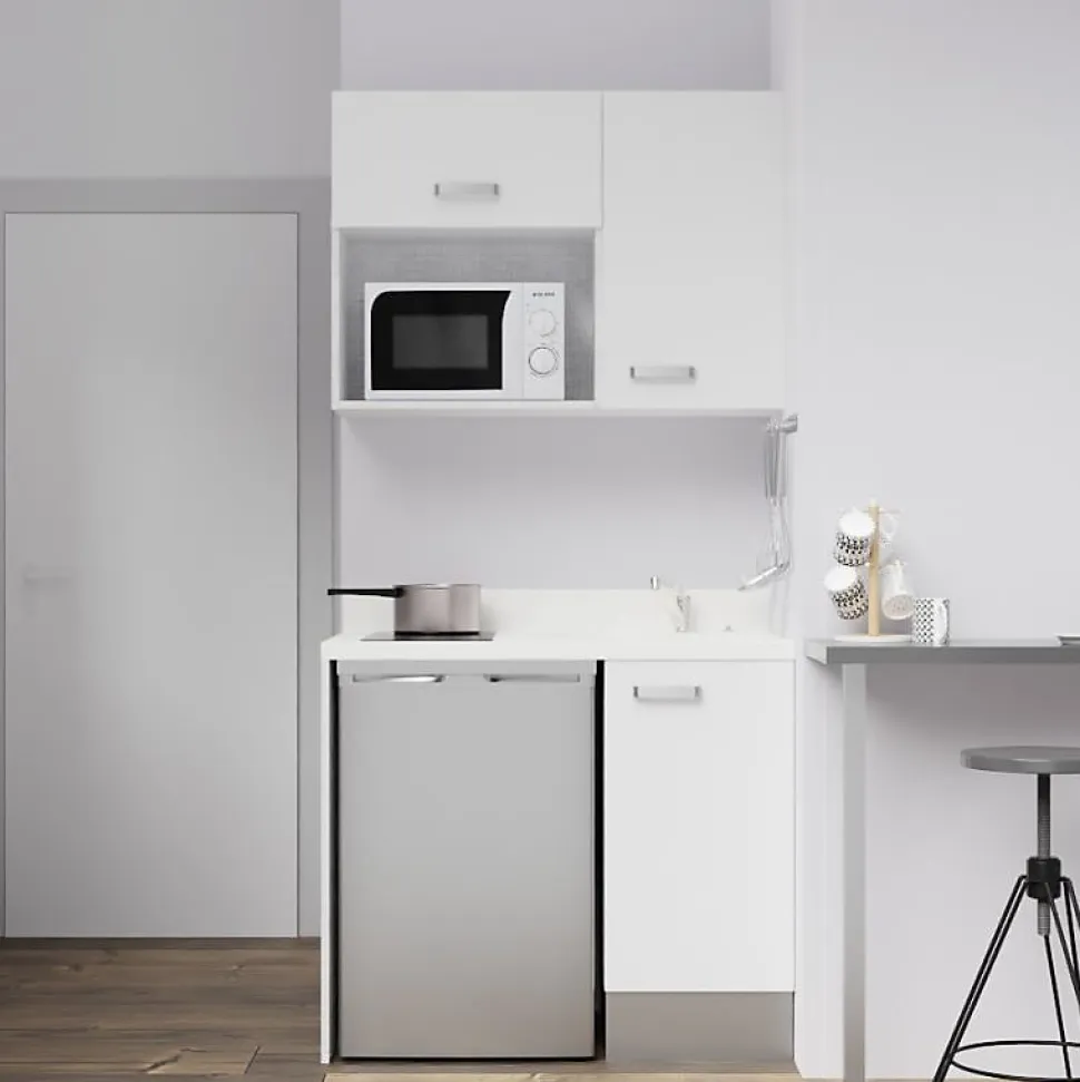 Découvrez nos kitchenettes contemporaines et durables. Le modèle K00L est le plus compact de la gamme de kitchenette. Sa largeur de 100 cm trouve sa place partout, même dans les plus petits studios. Le module est composé de meubles bas et hauts, d’un plan de travail monobloc avec évier évier intégré et d’emplacements pour un frigo et un micro-ondes. Composé de 80% de minéraux et 20 % de résine, le PlaniQuartz est à la fois élégant, durable et facile à installer. Personnalisez votre kitchenette avec ses : 4 coloris de façades au choix : blanc, gris, noir ou chêne 6 déclinaisons du Planiquartz. Coloris : blanc (Snova), gris (Cromo) ou noir (Néro) – Évier à gauche ou à droite Composition de la kitchenette K00L : 1 meuble bas sous évier 1 porte : L40 cm x H 70 cm x P 60 cm 1 jambage coloris Lino : L 60 cm x H 88 cm. 1 Planiquartz avec évier intégré (à droite ou à gauche), kit de vidage inclus (bonde et siphon) et découpe pour plaque de cuisson 2 feux : L100 cm x P63 cm (marge de tolérance 5mm), découpe pour l’encastrement : 49,7 cm x 28,1 cm (+/- 3mm) 1 socle PVC aspect alu (à recouper) : L 60 cm x H 17 cm (épaisseur 10 mm) 1 retour de socle PVC aspect alu : L 52.5 cm x H 17 cm (épaisseur 10 mm) 1 raccord de socle PVC aspect alu : H 17 cm 1 meuble de rangement haut 1 porte : L 40 cm x H 70 cm x P 35 cm 1 meuble haut avec emplacement pour micro-ondes et porte relevable : L 60 cm x H 70 cm x P 35 cm Poignées en inox brossé verni (possibilité de commander en option des poignées noires disponibles en accessoire). Tous les caissons et façades sont en panneau de particules mélaminé de 18 mm d’épaisseur. Caisson de meuble coloris gris clair aspect tissé. Garanties* : meubles 5 ans* planiquartz 3 ans* Emballage