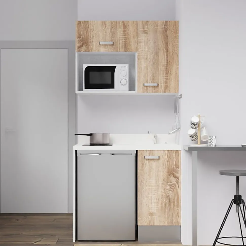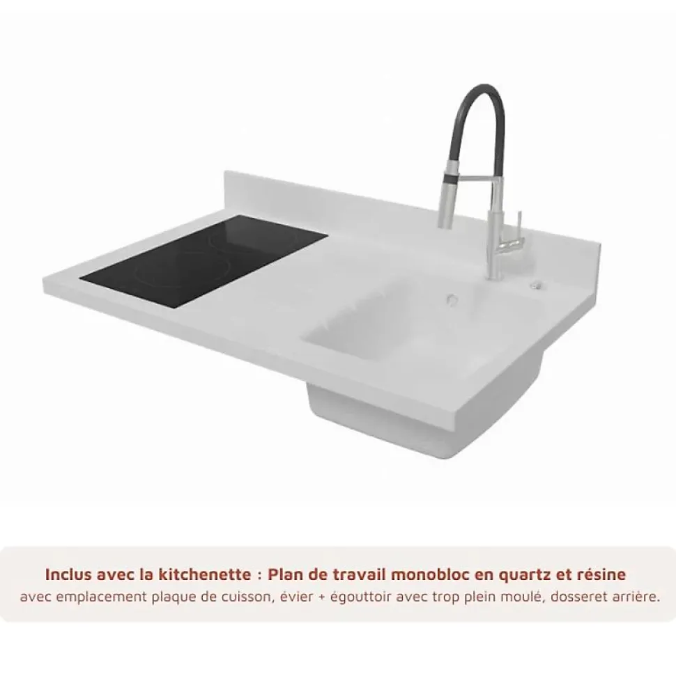 Découvrez nos kitchenettes contemporaines et durables. Le modèle K00L est le plus compact de la gamme de kitchenette. Sa largeur de 100 cm trouve sa place partout, même dans les plus petits studios. Le module est composé de meubles bas et hauts, d’un plan de travail monobloc avec évier évier intégré et d’emplacements pour un frigo et un micro-ondes. Composé de 80% de minéraux et 20 % de résine, le PlaniQuartz est à la fois élégant, durable et facile à installer. Personnalisez votre kitchenette avec ses : 4 coloris de façades au choix : blanc, gris, noir ou chêne 6 déclinaisons du Planiquartz. Coloris : blanc (Snova), gris (Cromo) ou noir (Néro) – Évier à gauche ou à droite Composition de la kitchenette K00L : 1 meuble bas sous évier 1 porte : L40 cm x H 70 cm x P 60 cm 1 jambage coloris Lino : L 60 cm x H 88 cm. 1 Planiquartz avec évier intégré (à droite ou à gauche), kit de vidage inclus (bonde et siphon) et découpe pour plaque de cuisson 2 feux : L100 cm x P63 cm (marge de tolérance 5mm), découpe pour l’encastrement : 49,7 cm x 28,1 cm (+/- 3mm) 1 socle PVC aspect alu (à recouper) : L 60 cm x H 17 cm (épaisseur 10 mm) 1 retour de socle PVC aspect alu : L 52.5 cm x H 17 cm (épaisseur 10 mm) 1 raccord de socle PVC aspect alu : H 17 cm 1 meuble de rangement haut 1 porte : L 40 cm x H 70 cm x P 35 cm 1 meuble haut avec emplacement pour micro-ondes et porte relevable : L 60 cm x H 70 cm x P 35 cm Poignées en inox brossé verni (possibilité de commander en option des poignées noires disponibles en accessoire). Tous les caissons et façades sont en panneau de particules mélaminé de 18 mm d’épaisseur. Caisson de meuble coloris gris clair aspect tissé. Garanties* : meubles 5 ans* planiquartz 3 ans* Emballage