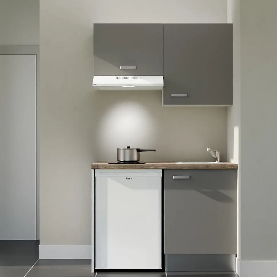 La kitchenette de 120 cm fonctionnelle et complète, proposée avec un plan de travail et un évier au choix. Elle vous permet d’intégrer l’essentiel dans un module compact de 120 cm avec un meuble bas sous évier, un meuble sur hotte, un meuble de rangement haut, ainsi qu’un emplacement pour intégrer un frigo top. Personnalisez votre kitchenette avec ses : 4 coloris de façades : blanc mat, gris mat, noir ou chêne Plan de travail et crédences au choix : blanc, chêne, gris effet béton, noir texturé effet pierre. 4 choix éviers à encastrer : Cuve Resiroc (blanc, gris, noir) ou Cuve Inox (Certaines combinaisons ne sont pas disponibles) Notre conseil déco : Les coloris bois (aspect chêne texturé) et gris des façades et du plan de travail sont différents. Nous vous conseillons plutôt choisir les associations suivantes : façades bois avec plan de travail blanc, gris ou noir ; façades blanches ou grises avec le plan de travail chêne ou noir. Reportez-vous aux images pour visualiser le rendu de chaque configuration sélectionnée ! Composition de la kitchenette K01L avec plan de travail et évier : 1 meuble bas sous évier une porte : L 60 x H 70 x P 60 cm Pieds réglables de 10 à 17 cm pour le caisson bas. 1 meuble de rangement haut une porte : L 60 x H 70 x P 35 cm 1 meuble haut sur hotte : L 60 x H 45 x P 35 cm 1 plan de travail stratifié : L 120 cm x P 63 cm Selon l’option choisie, crédences assorties au plan de travail : 1 crédence 120 cm de largeur x 35 cm de hauteur, un retour de crédence coté évier de 60 cm de largeur x 35 cm de hauteur. 1 évier encastrable au choix : Modèle RESIROC en résine, coloris blanc, gris ou noir 1 bac sans égouttoir L 54 cm x P 44 cm, équipé
