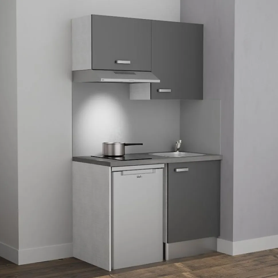 La kitchenette de 120 cm fonctionnelle et complète, proposée avec un plan de travail et un évier au choix. Elle vous permet d’intégrer l’essentiel dans un module compact de 120 cm avec un meuble bas sous évier, un meuble sur hotte, un meuble de rangement haut, ainsi qu’un emplacement pour intégrer un frigo top. Personnalisez votre kitchenette avec ses : 4 coloris de façades : blanc mat, gris mat, noir ou chêne Plan de travail et crédences au choix : blanc, chêne, gris effet béton, noir texturé effet pierre. 4 choix éviers à encastrer : Cuve Resiroc (blanc, gris, noir) ou Cuve Inox (Certaines combinaisons ne sont pas disponibles) Notre conseil déco : Les coloris bois (aspect chêne texturé) et gris des façades et du plan de travail sont différents. Nous vous conseillons plutôt choisir les associations suivantes : façades bois avec plan de travail blanc, gris ou noir ; façades blanches ou grises avec le plan de travail chêne ou noir. Reportez-vous aux images pour visualiser le rendu de chaque configuration sélectionnée ! Composition de la kitchenette K01L avec plan de travail et évier : 1 meuble bas sous évier une porte : L 60 x H 70 x P 60 cm Pieds réglables de 10 à 17 cm pour le caisson bas. 1 meuble de rangement haut une porte : L 60 x H 70 x P 35 cm 1 meuble haut sur hotte : L 60 x H 45 x P 35 cm 1 plan de travail stratifié : L 120 cm x P 63 cm Selon l’option choisie, crédences assorties au plan de travail : 1 crédence 120 cm de largeur x 35 cm de hauteur, un retour de crédence coté évier de 60 cm de largeur x 35 cm de hauteur. 1 évier encastrable au choix : Modèle RESIROC en résine, coloris blanc, gris ou noir 1 bac sans égouttoir L 54 cm x P 44 cm, équipé