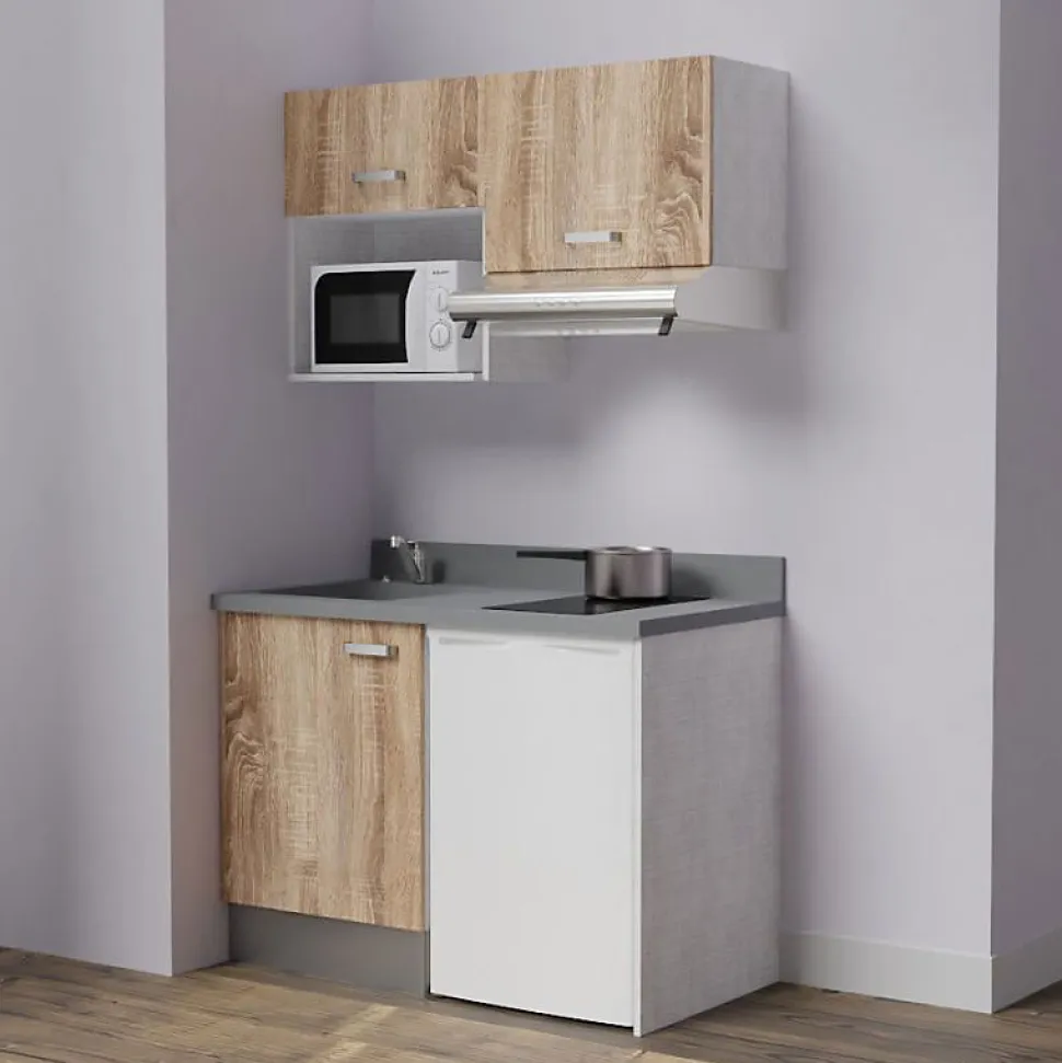 Kitchenette K02 – 120 cm – façades Bois – Plan monobloc en quartz coloris Cromo évier à gauche