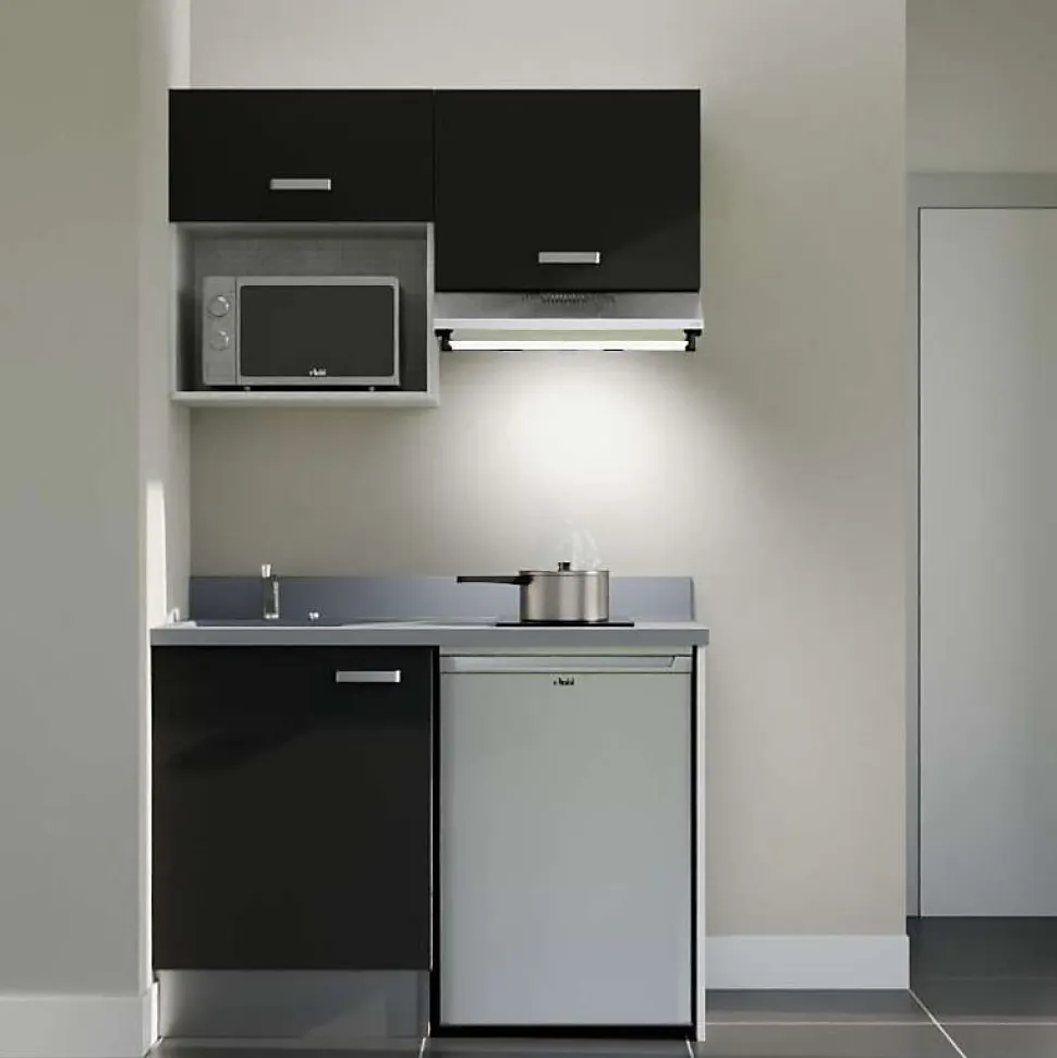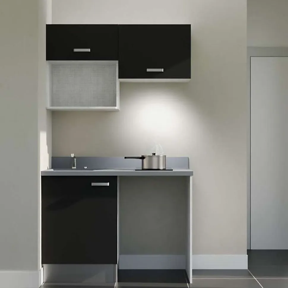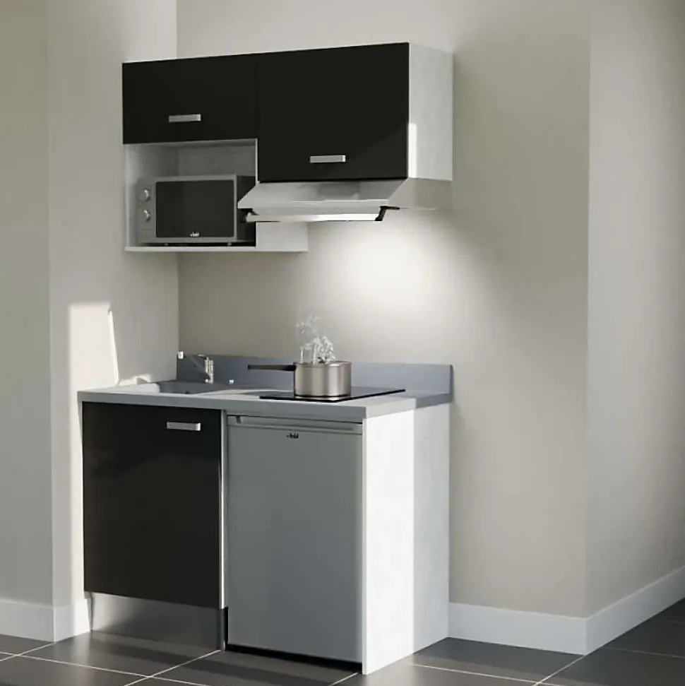 Découvrez nos kitchenettes contemporaines et durables. Le modèle K02L est un ensemble complet de kitchenette de 120 cm linéaire. Il comprend les meubles bas et hauts, avec emplacements pour intégrer votre électroménager : frigo, micro-ondes, hotte. Ainsi qu’un plan de travail monobloc avec évier intégré et découpe pour table de cuisson 2 feux. Composé de 80% de minéraux et 20 % de résine, ce PlaniQuartz est à la fois élégant, durable et facile à installer. Personnalisez votre kitchenette avec ses : 4 coloris de façades au choix : blanc, gris, noir ou chêne 6 déclinaisons du Planiquartz. Coloris : blanc (Snova), gris (Cromo) ou noir (Néro)- Évier à gauche ou à droite Composition de la kitchenette K02 : 1 meuble bas sous évier 1 porte : L 60 cm x H 70 cm x P 60 cm 1 jambage coloris Gris clair (coloris caisson) : L 60 cm x H 88 cm. Épaisseur 19 mm 1 plan monobloc planiquartz avec évier intégré, kit de vidage inclus (bonde et siphon), et découpe pour plaque de cuisson 2 feux (découpe pour l’encastrement : 49,7 cm x 28,1 cm (+/- 3mm)) : L 120 x P 63 cm (marge de tolérance 5mm). 3 coloris au choix. 1 socle PVC aspect alu : L 60 cm x H 17 cm (épaisseur 10 mm) 1 retour de socle PVC aspect alu : L 52.5 cm x H 17 cm (épaisseur 10 mm) 1 raccord de socle PVC aspect alu : H 17 cm 1 meuble haut 1 porte avec niche pour micro-ondes: L 60 cm x H 70 cm x P 35 cm 1 meuble haut sur hotte : L 60 cm x H 45 cm x P 35 cm Poignées en inox brossé verni (poignées noires disponibles en option) Tous les caissons et façades sont en panneau de particules mélaminé de 18 mm d’épaisseur. Caisson de meuble coloris gris clair aspect tissé. Garanties* : meubles 5 ans* planiquartz 3 ans* Emballage en carton 100%