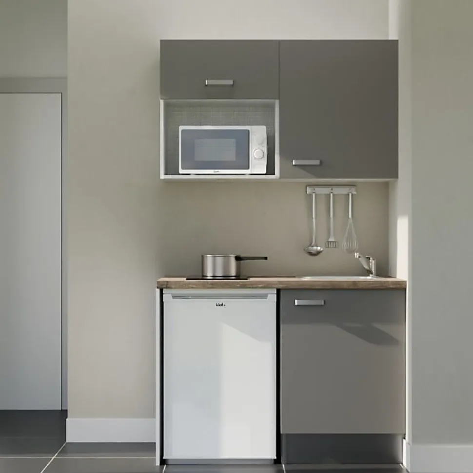 La kitchenette de 120 cm fonctionnelle et complète, proposée avec un plan de travail et un évier au choix. Elle vous permet d’intégrer l’essentiel dans un module compact de 120 cm avec un meuble bas sous évier, un meuble haut avec niche micro-ondes, un meuble de rangement haut, ainsi qu’un emplacement pour intégrer un frigo top. Personnalisez votre kitchenette avec ses : 4 coloris de façades : blanc, gris, noir ou chêne Plan de travail et crédences au choix : blanc, chêne, gris effet béton, noir texturé effet pierre. 4 choix éviers à encastrer : Cuve Resiroc (blanc, gris, noir) ou Cuve Inox (Certaines combinaisons ne sont pas disponibles) Notre conseil déco : Les coloris bois (aspect chêne texturé) et gris des façades et du plan de travail sont différents. Nous vous conseillons plutôt choisir les associations suivantes : façades bois avec plan de travail blanc, gris ou noir ; façades blanches ou grises avec le plan de travail chêne ou noir. Reportez-vous aux images pour visualiser le rendu de chaque configuration sélectionnée ! Composition de la kitchenette K07L avec plan de travail et évier : 1 meuble bas sous évier une porte : L 60 x H 70 x P 60 cm Pieds réglables de 10 à 17 cm pour le caisson bas. 1 meuble de rangement haut une porte : L 60 x H 70 x P 35 cm 1 meuble haut pour micro-ondes avec porte relevable : L 60 x H 70 x P 35 cm 1 plan de travail stratifié : L 120 cm x P 63 cm Selon l’option choisie, crédences assorties au plan de travail : 1 crédence 120 cm de largeur x 35 cm de hauteur, un retour de crédence coté évier de 60 cm de largeur x 35 cm de hauteur. 1 évier encastrable au choix : Modèle RESIROC en résine, coloris blanc, gris ou noir 1 bac sans