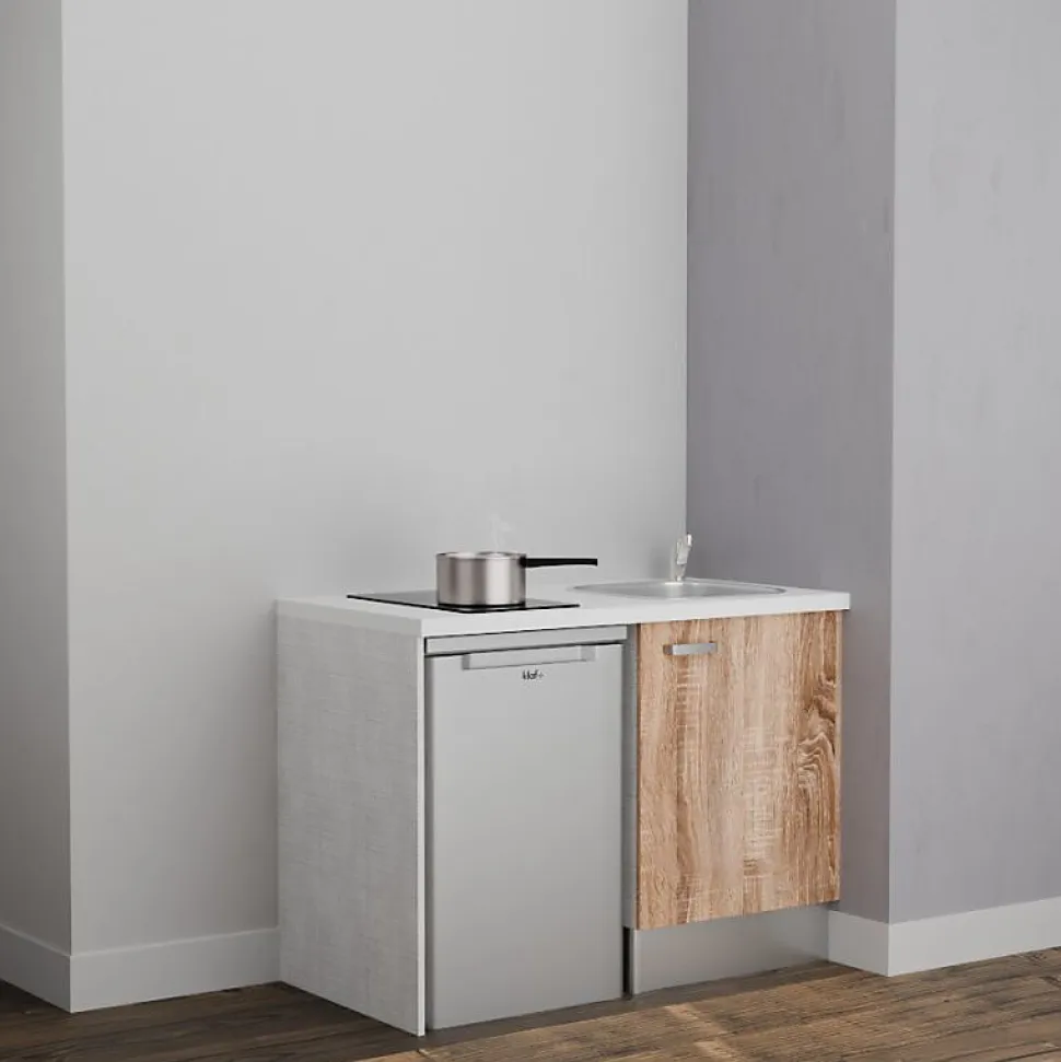 Kitchenette K08 - 120 cm - Façades : Bois - Plan de travail : Blanc - Crédences : Non - Evier Inox