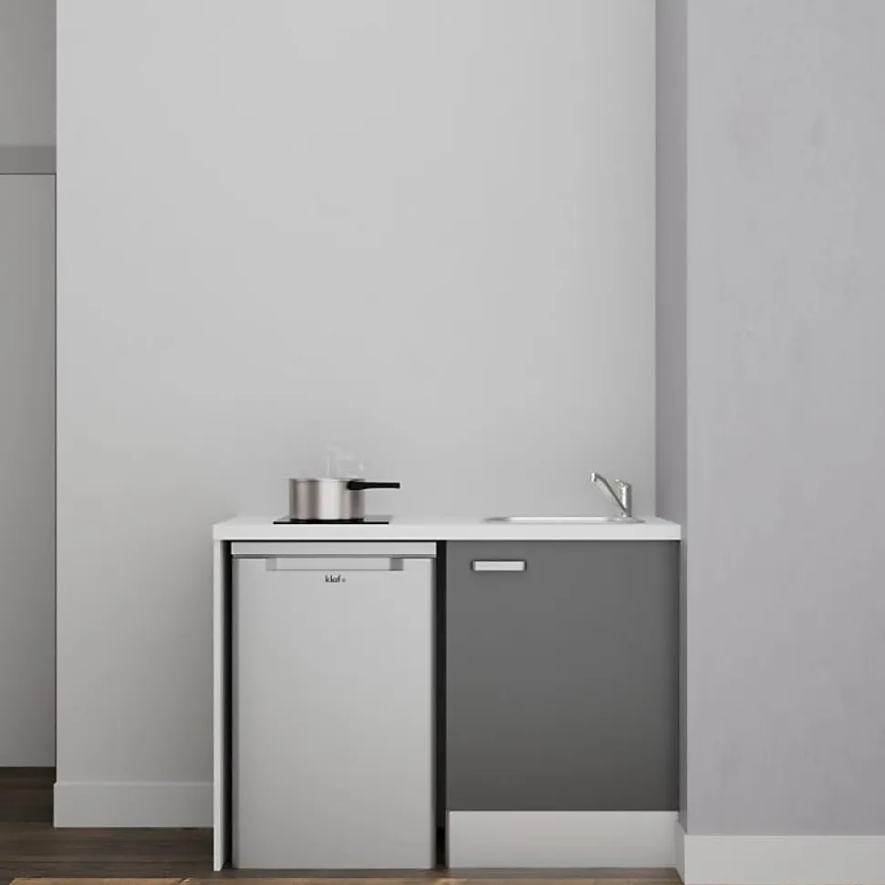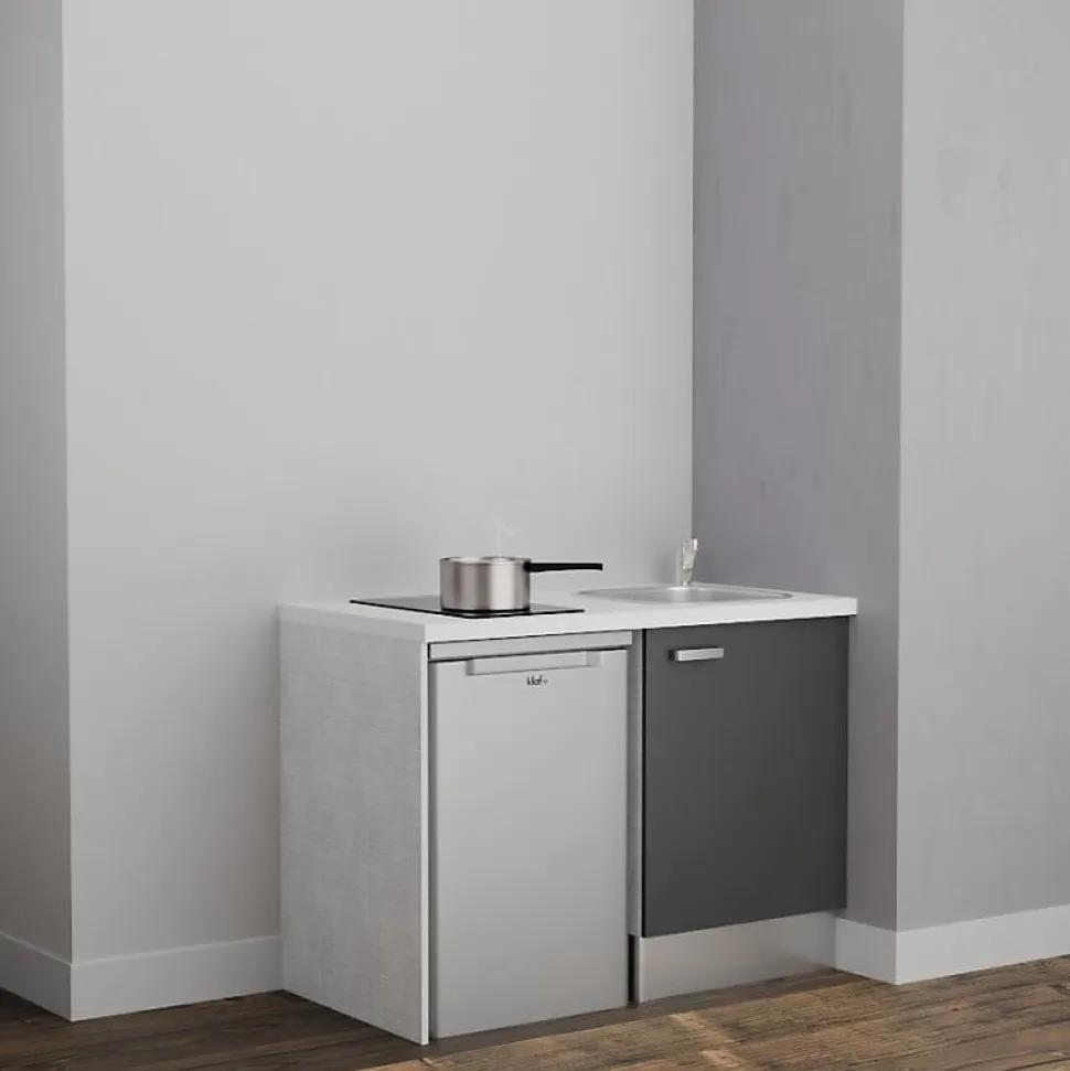 La kitchenette basse de 120 cm, simple et fonctionnelle. Composée d’un meuble bas sous évier, d’un plan de travail et d’un évier, elle dispose d’un emplacement pour intégrer un frigo top. Personnalisez votre kitchenette avec ses : 4 coloris de façades : blanc mat, gris mat, noir ou chêne Plan de travail et crédences au choix : blanc, chêne, gris effet béton, noir texturé effet pierre. 4 choix éviers à encastrer : Cuve Resiroc (blanc, gris, noir) ou Cuve Inox (Certaines combinaisons ne sont pas disponibles) Notre conseil déco : Les coloris bois (aspect chêne texturé) et gris des façades et du plan de travail sont différents. Nous vous conseillons plutôt choisir les associations suivantes : façades bois avec plan de travail blanc, gris ou noir ; façades blanches ou grises avec le plan de travail chêne ou noir. Reportez-vous aux images pour visualiser le rendu de chaque configuration sélectionnée ! Composition de la kitchenette K08 avec plan de travail et évier : 1 meuble bas sous évier une porte : L 60 x H 70 x P 60 cm Pieds réglables de 10 à 17 cm pour le caisson bas. 1 plan de travail stratifié : L 120 cm x P 63 cm Selon l’option choisie, crédences assorties au plan de travail : 1 crédence 120 cm de largeur x 35 cm de hauteur, un retour de crédence coté évier de 60 cm de largeur x 35 cm de hauteur. 1 évier encastrable au choix : Modèle RESIROC en résine, coloris blanc, gris ou noir 1 bac sans égouttoir L 54 cm x P 44 cm, équipé d’un trop plein, vidage manuel de la bonde. L’évier Résiroc est conçu en matériaux composites (résine polyester, fibres de verre et charges minérales compressées) qui permettent une grande résistance aux rayures, chocs et températures