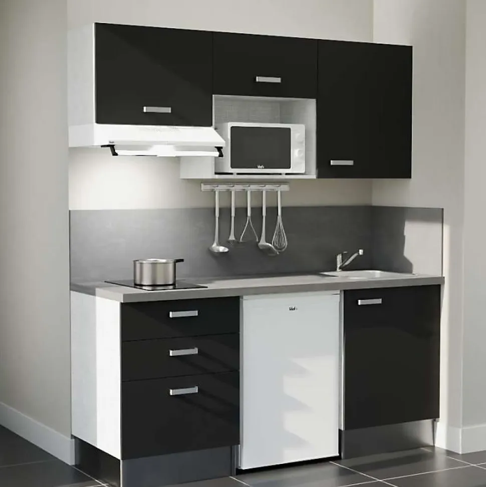 - Electroménager inclus : Frigo top, Plaque de cuisson vitrocéramique 2 feux, Hotte casquette, Micro-ondes