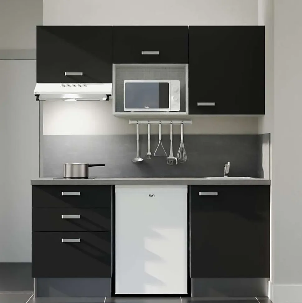 Aménagez votre studio avec la kitchenette K20L de 180 cm, conçue pour optimiser chaque mètre carré tout en alliant style et praticité. Cette cuisine compacte et fonctionnelle inclut des meubles hauts et bas, un plan de travail stratifié résistant, un évier en inox ainsi que l’électroménager nécessaire : réfrigérateur, micro-ondes et hotte. Idéale pour les petits espaces, elle vous permet de créer un coin cuisine moderne et parfaitement équipé. Personnalisez votre kitchenette en choisissant vos options et coloris disponibles : 4 coloris de façades au choix : blanc mat, gris mat, noir ou bois (chêne naturel) 4 coloris de plan de travail au choix : blanc mat, gris (aspect béton), noir (texturé effet pierre) ou bois (chêne Slavonie) Option avec ou sans crédences assorties 2 finitions pour l’électroménager (frigo, hotte, micro-ondes) : blanc ou inox (plaque de cuisson vitrocéramique noire) Notre conseil déco : Les coloris bois (aspect chêne texturé) et gris des façades et du plan de travail sont différents. Nous vous conseillons plutôt choisir les associations suivantes : façades bois avec plan de travail blanc, gris ou noir ; façades blanches ou grises avec le plan de travail chêne ou noir. Reportez-vous aux images pour visualiser le rendu de chaque configuration sélectionnée ! Composition de la kitchenette 180 cm K20 avec plan de travail et évier : 1 meuble bas sous évier 1 porte : L 60 cm x H 70 cm x P 60 cm 1 meuble de rangement bas avec 3 tiroirs dont un casserolier : L60 cm x H 70 cm x P 60 cm 1 plan de travail stratifié : L 180 cm x P 63 cm Selon l’option choisie, crédences assorties au plan de travail : 1 crédence 180 cm de largeur x