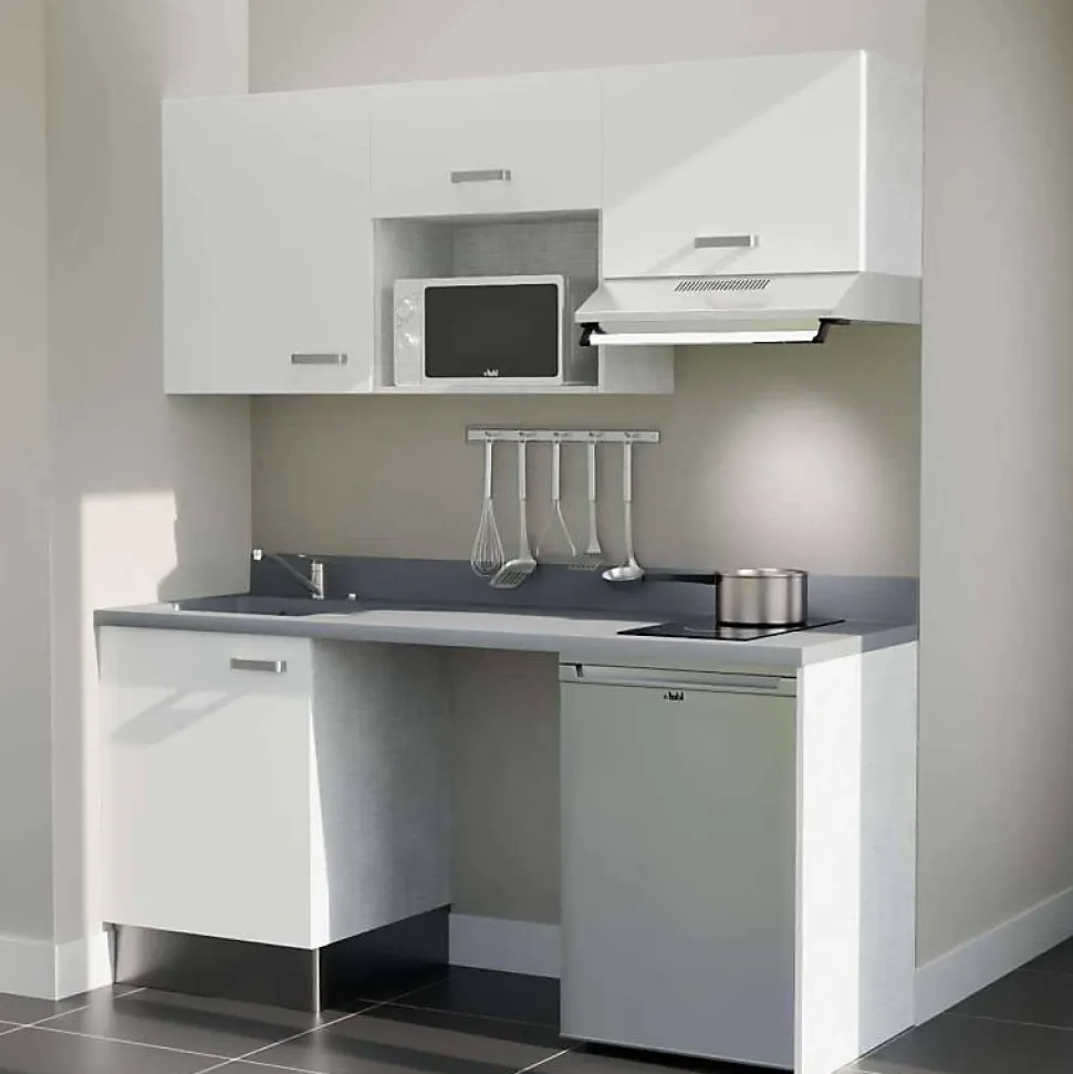 - Electroménager inclus : Frigo top, Plaque de cuisson vitrocéramique 2 feux, Hotte casquette, Micro-ondes