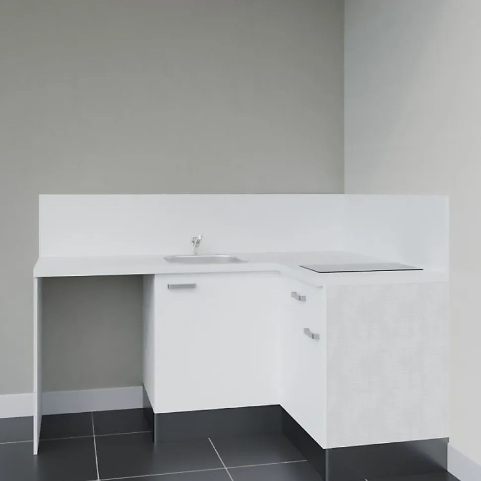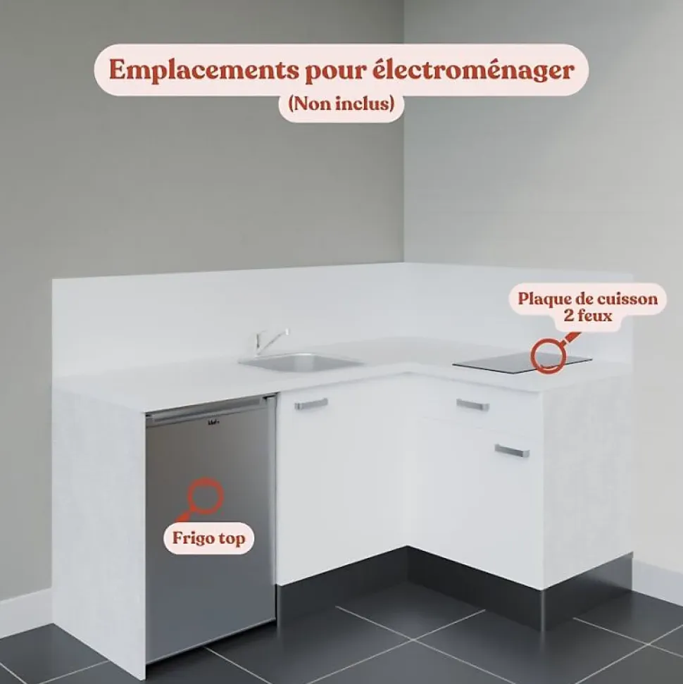 La kitchenette d’angle, simple et fonctionnelle. Composée de deux meubles bas, d’un plan de travail et d’un évier en inox, elle dispose d’un emplacement pour intégrer un frigo top. Personnalisez votre kitchenette avec ses : 4 coloris de façades au choix : blanc, gris, noir ou bois (chêne naturel) 4 coloris de plan de travail au choix : blanc mat, gris (aspect béton), noir (texturé effet pierre) ou bois (chêne Slavonie) Option avec ou sans crédences assorties Reportez-vous aux images pour visualiser le rendu de chaque configuration sélectionnée ! Composition de la kitchenette KA01 avec plan de travail et évier : 1 meuble bas sous évier une porte : L 60 x H 70 x P 60 cm 1 meuble bas une porte avec un tiroir : L 60 x H 70 x P 60 cm 2 plans de travail stratifié : L 140 cm x P 63 cm à recouper. Selon l’option choisie, crédences assorties au plan de travail : 1 crédence 200 cm x 35 cm et 1 autre crédence de 140 cm x 35 cm à recouper. 1 évier sans égouttoir EVINOX. Dimension 44×44 cm. Ce modèle est composé d’inox SS304 pour une grande durabilité et d’une finition brossée très élégante. 1 jambage bas : L 60 x H 88 cm 2 fileurs 10 cm recoupables 2 plinthes PVC aspect alu recoupables : L 80 x H 17 cm (épaisseur 10 mm) 2 retours de plinthe PVC aspect alu : L 52.5 x H 17 cm (épaisseur 10 mm) 3 raccords de plinthe en angle PVC aspect alu : H 17 cm Poignées en inox brossé Caissons coloris gris clair aspect tissé et façades (coloris au choix) en panneau de particules mélaminé de 18
