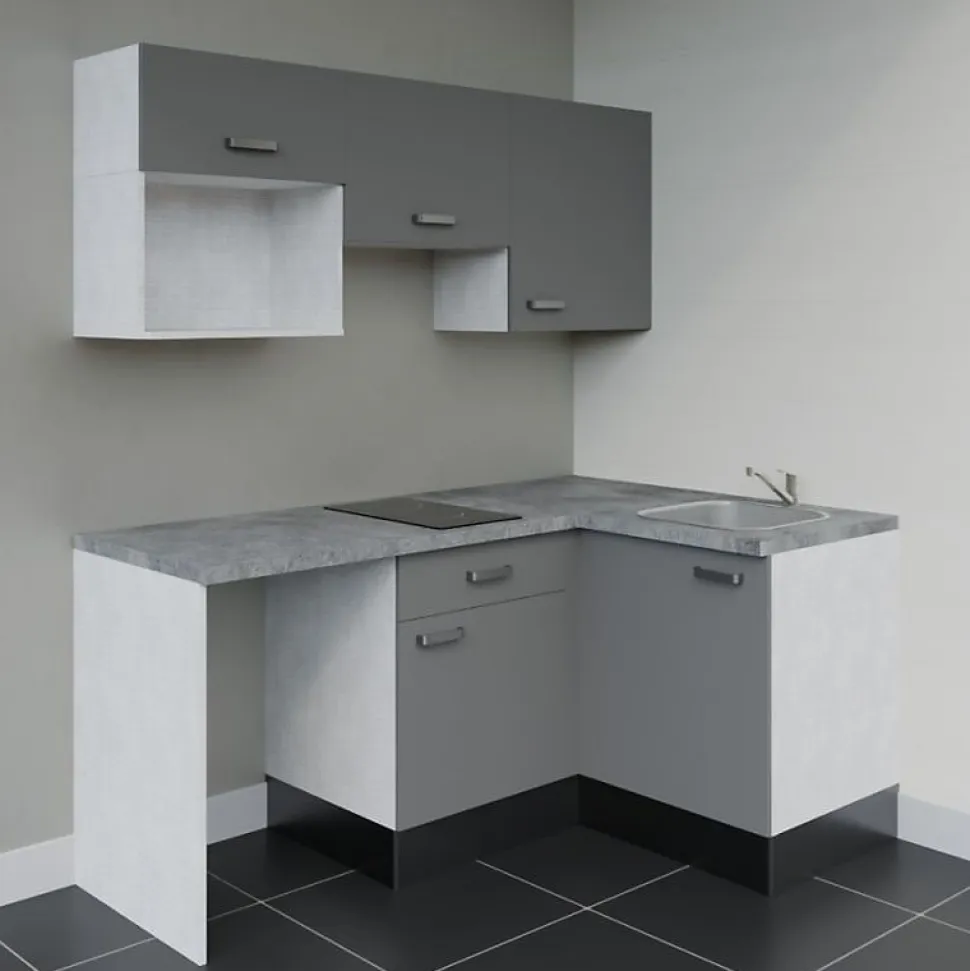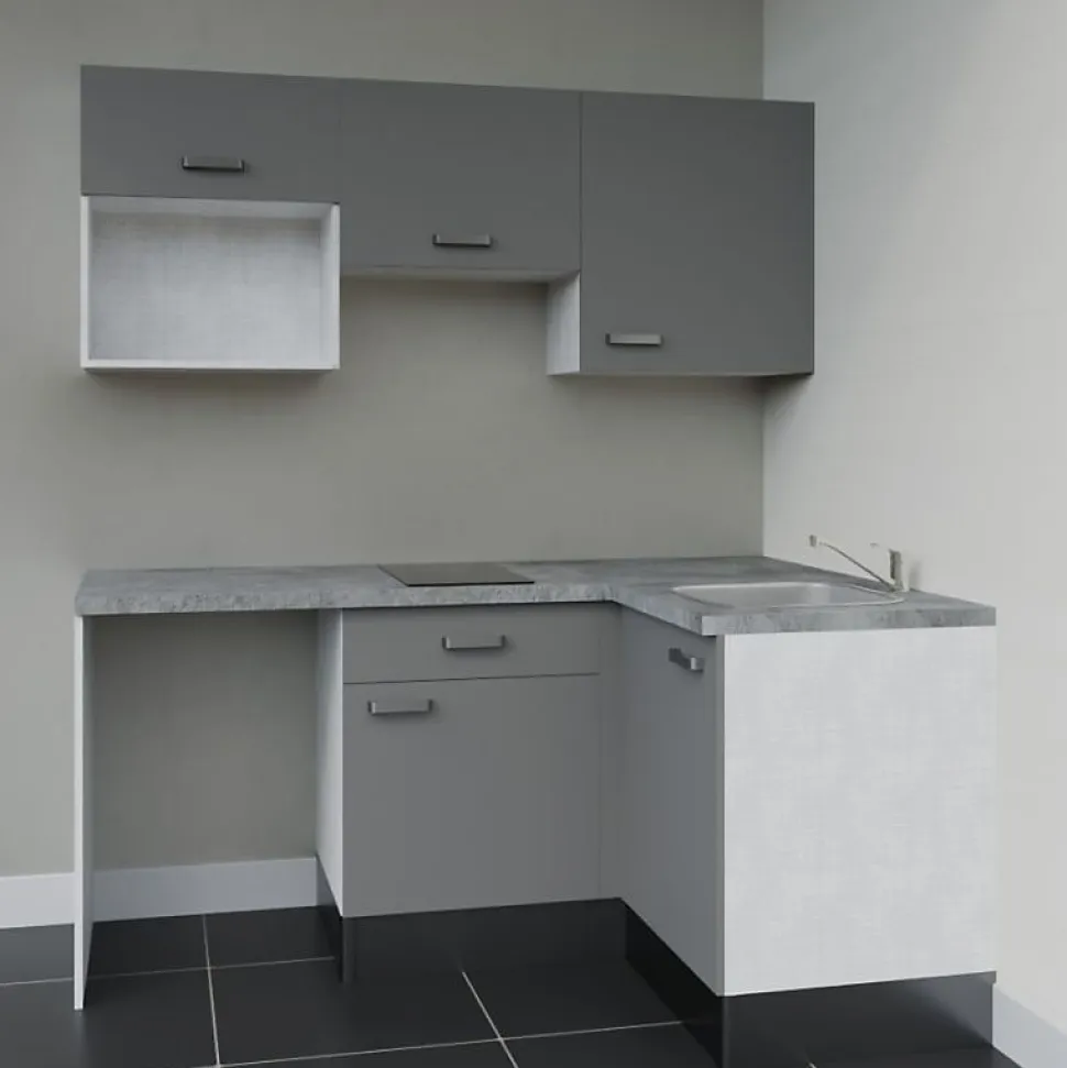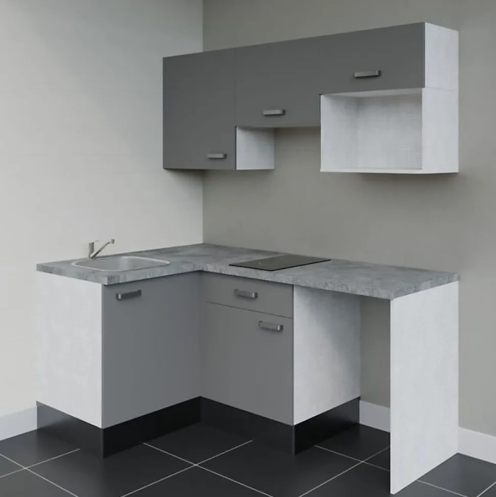 La kitchenette d’angle, simple et fonctionnelle. Composée de cinq meubles, d’un plan de travail et d’un évier en inox, elle dispose d’emplacements pour intégrer : frigo top, plaque de cuisson, micro-ondes et hotte. Personnalisez votre kitchenette avec ses : 4 coloris de façades au choix : blanc mat, gris mat, noir ou bois (chêne naturel) 4 coloris de plan de travail au choix : blanc mat, gris (aspect béton), noir (texturé effet pierre) ou bois (chêne Slavonie) Option avec ou sans crédences assorties Notre conseil déco : Les coloris bois (aspect chêne texturé) et gris des façades et du plan de travail sont différents. Nous vous conseillons plutôt choisir les associations suivantes : façades bois avec plan de travail blanc, gris ou noir ; façades blanches ou grises avec le plan de travail chêne ou noir. Reportez-vous aux images pour visualiser le rendu de chaque configuration sélectionnée ! Composition de la kitchenette KA03 avec plan de travail et évier : 1 meuble bas sous évier une porte : L 60 x H 70 x P 60 cm 1 meuble bas une porte avec un tiroir : L 60 x H 70 x P 60 cm 1 meuble de rangement haut une porte : L 60 x H 70 x P 35 cm 1 meuble haut sur hotte : L 60 x H 45 x P 35 cm 1 meuble haut avec emplacement micro-ondes et porte relevable (vérin à gaz) : L 60 cm x H 70 cm x P 35 cm 2 plans de travail stratifié : L 140 cm x P 63 cm à recouper Selon l’option choisie, crédences assorties au plan de travail : 1 crédence 200 cm x 35 cm et 1 autre crédence de 140