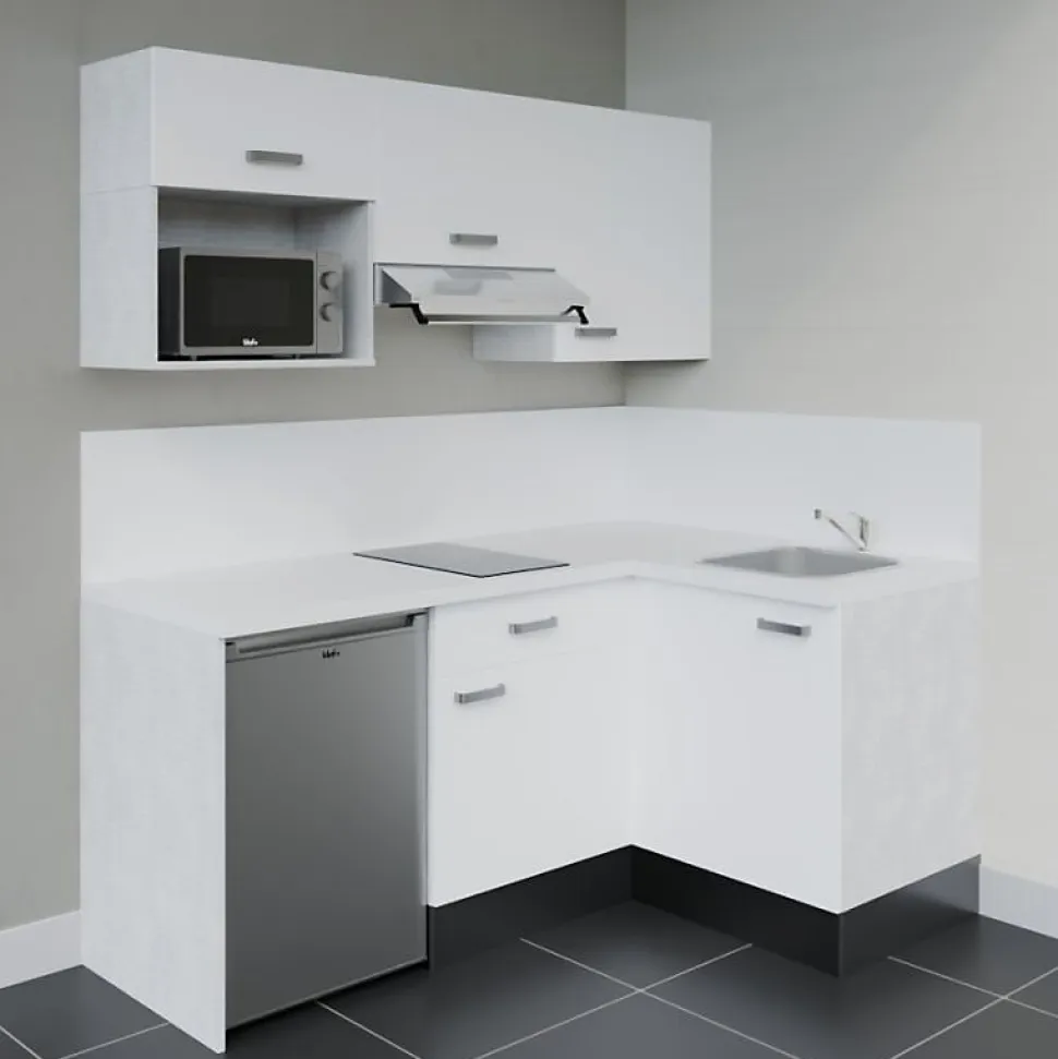 La kitchenette d’angle, simple et fonctionnelle. Composée de cinq meubles, d’un plan de travail et d’un évier en inox, elle dispose d’emplacements pour intégrer l’électroménager inclus : frigo top, plaque de cuisson vitrocéramique 2 feux, micro-ondes et hotte. Personnalisez votre kitchenette avec ses : 4 coloris de façades au choix : blanc, gris, noir ou bois (chêne naturel) 4 coloris de plan de travail au choix : blanc mat, gris (aspect béton), noir (texturé effet pierre) ou bois (chêne Slavonie) Option avec ou sans crédences assorties 2 coloris d’électroménager blanc ou gris inox Reportez-vous aux images pour visualiser le rendu de chaque configuration sélectionnée ! Composition de la kitchenette d’angle KA03 : 1 meuble bas sous évier une porte : L 60 x H 70 x P 60 cm 1 meuble bas une porte avec un tiroir : L 60 x H 70 x P 60 cm 1 meuble de rangement haut une porte : L 60 x H 70 x P 35 cm 1 meuble haut sur hotte : L 60 x H 45 x P 35 cm 1 meuble haut avec emplacement micro-ondes et porte relevable (vérin à gaz) : L 60 cm x H 70 cm x P 35 cm 2 plans de travail stratifié : L 140 cm x P 63 cm à recouper Selon l’option choisie, crédences assorties au plan de travail : 1 crédence 200 cm x 35 cm et 1 autre crédence de 140 cm x 35 cm à recouper. 1 évier sans égouttoir EVINOX. Dimension 44×44 cm. Ce modèle est composé d’inox SS304 pour une grande durabilité et d’une finition brossée très élégante. 1 jambage bas : L 60 x H 88 cm