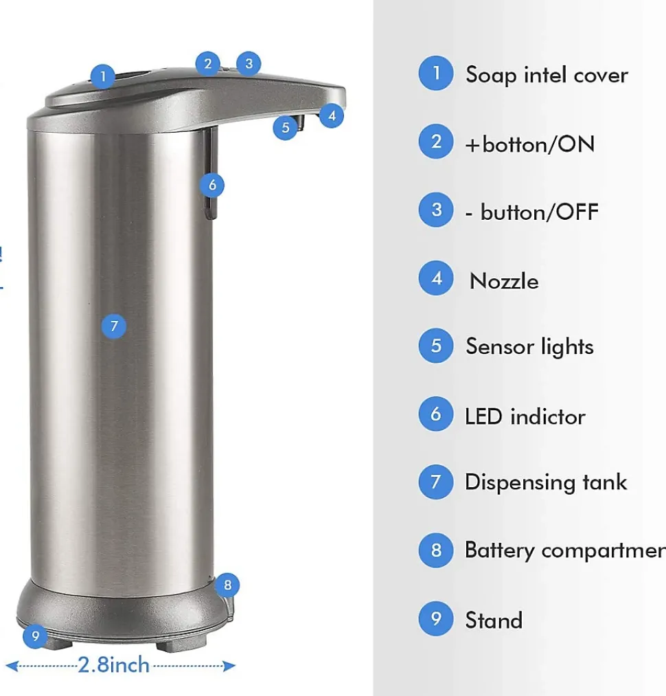 Automatique – Capacité de 250 ml. Ce distributeur de savon avec capteur intégré détecte automatiquement les mains fermées et distribue le savon.Alimentation par piles – Le distributeur de savon fonctionne avec quatre piles AAA (non fournies). Le cordon d’alimentation est flexible et peut être facilement placé où vous le souhaitez.Apparence simple – Fabriqué en acier inoxydable de haute qualité, ce distributeur de savon est robuste et durable, offrant une longue durée de vie.Applications multiples – Ce distributeur de savon est largement utilisé dans les restaurants, les hôtels, les cuisines, les salles de bains, les hôpitaux, etc.