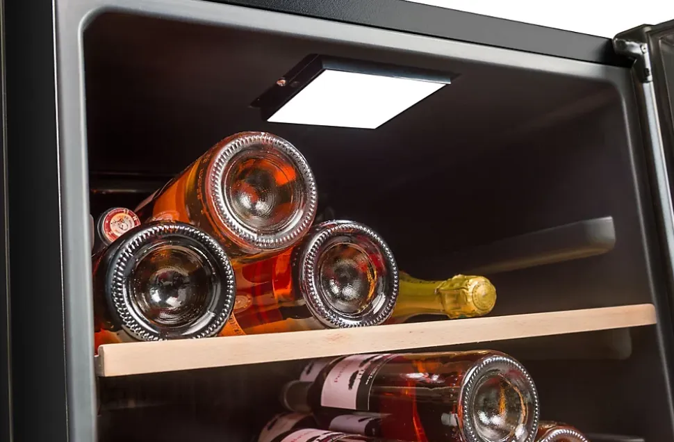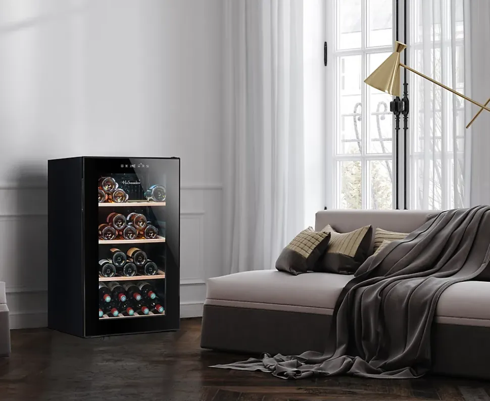 Cave à vin de service La Sommelière LS52BLACK – Compacte et élégante, cette cave pose-libre mono-zone offre une capacité de 52 bouteilles type Bordeaux 75 cl – Sa plage de température réglable de 5 à 20°C permet de mettre à température de dégustation tous vos vins – Le panneau de contrôle digital extérieur facilite les réglages sans perturber la température intérieure – La porte vitrée en double vitrage, verre trempé traité anti-UV, protège vos bouteilles tout en les mettant en valeur grâce à l’éclairage LED blanc froid – Les 3 clayettes et la demi-clayette en bois naturel, amovibles et anti-vibration, assurent un rangement stable et soigné – Le système de refroidissement brassé garantit une température homogène – Fonctionnant à seulement 36 dB et classée F avec une consommation annuelle de 105 kWh, elle combine discrétion et efficacité énergétique – Son design All Black avec poignée intégrée s’harmonise facilement avec tous les intérieurs – Compatible avec l’application Vinotag : Accédez à une représentation virtuelle détaillée.