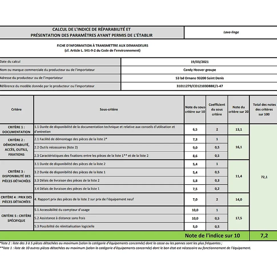 Lave-linge frontal 10kg 1200 tours/min noir Candy – Le lave-linge frontal SmartPro CO12103DBBE/1-47 de Candy est doté de 9 cycles rapides, dont un cycle pleine charge en 59 minutes seulement. Smart, simple et rapide! un lave-linge qui fera gagner du temps au quotidien. Grâce à l’application simplyFi, accédez à + de 40 programmes supplémentaires, recevez des alertes de fin de cycle et prolongez la durée de vie de votre machine. Un hublot large et réhaussé pour maximiser le confort d’utilisation. – Type de produit : Lave-linge frontal.Gamme : SmartPro.Fonction séchage : Non.Type de chargement : Frontal.Capacité nominale programme Eco 40-60 (kg) : 10.IEE : 91.Classe d’efficacité énergétique : E.Indice d’efficacité de lavage : 1.04.Efficacité de rinçage (g/kg) : 4.90.Conso. d’énergie pondérée pour 100 cycles (kWh) : 90.Conso. d’énergie cycle lavage »Eco 40-60 » (kWh) : 0.899.Conso. d’eau pondérée par cycle (litres) : 51.Temp. max. (°C) à l’intérieur du textile traité (capacité nominale) : 44.Temp. max. (°C) à l’intérieur du textile traité (moitié) : 45.Temp. max. (°C) à l’intérieur du textile traité (quart) : 28.Taux d’humidité résiduelle pondéré (%) : 53.Vitesse d’essorage (t/min) : 1200.Classe d’efficacité d’essorage : B.Durée du programme »Eco 40-60 » capacité nominale (h:min) : 3:59.Durée du programme »Eco 40-60 » moitié (h:min) : 3:00.Durée du programme »Eco 40-60 » quart (h:min) : 3:00.Emissions de bruit acoustique dans l’air (dB(A)) : 79.Classe d’émission de bruit acoustique dans l’air : C.Mode arrêt (W) : 0.5.Mode veille (W) : 1.Démarrage différé (W) : 4.Mode veille avec maintien de la connexion au réseau (W) : 2.Type de construction : Pose libre.Volume tambour (L) : 66.Lave-linge connecté : Oui.Type de connectivité : Wi-Fi (appli simplyFi).Technologie vapeur : Non.Programmateur électronique :