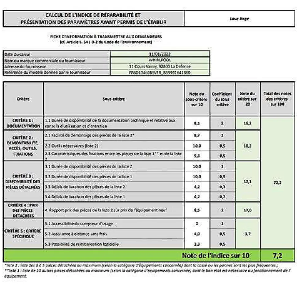Lave-linge frontal 10kg 1400 tours/min blanc Whirlpool – Lave-linge frontal Whirlpool FFBD10469BSVFR avec 100% fraîcheur même si vous oubliez votre linge, grâce à la technologie Vapeur FreshCare+. Grâce à l’action combinée de la vapeur et du brassage en fin de cycle, le système FreshCare+ préserve votre linge et le garde frais et sans odeur jusqu’à 6 heures après la fin du cycle. Le programme Steam Refresh diffuse de la vapeur et régénère ainsi la fraîcheur de vos vêtements en évitant les lavages inutiles. Les odeurs désagréables disparaissent et les plis sont lissés. Vos vêtements sont prêts à porter en 20 min. Moteur Induction : Robuste, durable et silencieux, il réduit les vibrations et le niveau de bruit émis par l’appareil. Economisez jusqu’à 60% d’énergie, 35% d’eau et 35% de temps : Grâce à ses capteurs intelligents, il mesure et surveille l’eau et le couple du moteur, plusieurs algorithmes détectent et définissent pour chaque phase de lavage, du premier mouillage jusqu’au rinçage final. Un tambour XXL pour laver une grande quantité de vêtements ainsi que des articles volumineux ! – Type de produit : Lave-linge frontal.Fonction séchage : Non.Type de chargement : Frontal.Capacité nominale programme Eco 40-60 (kg) : 10.IEE : 52.Classe d’efficacité énergétique : A.Indice d’efficacité de lavage : 1.031.Efficacité de rinçage (g/kg) : 4.9.Conso. d’énergie pondérée pour 100 cycles (kWh) : 51.Conso. d’énergie cycle lavage »Eco 40-60 » (kWh) : 0.514.Conso. d’eau pondérée par cycle (litres) : 52.Temp. max. (°C) à l’intérieur du textile traité (capacité nominale) : 31.Temp. max. (°C) à l’intérieur du textile traité (moitié) : 29.Temp. max. (°C) à l’intérieur du textile traité (quart) : 25.Taux d’humidité résiduelle pondéré (%) : 53.Vitesse d’essorage (t/min) : 1400.Classe d’efficacité d’essorage : B.Durée du programme »Eco 40-60 » capacité nominale (h:min) : 3:55.Durée du