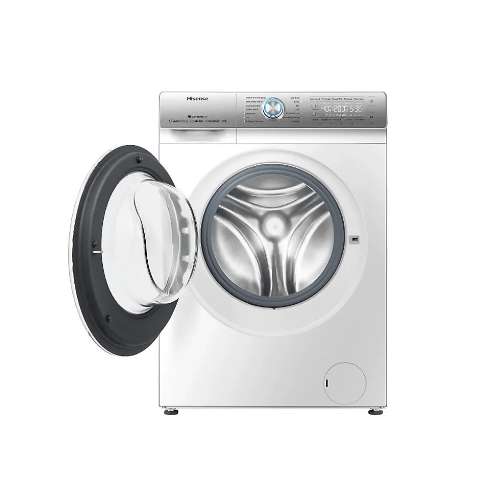 Lave-linge frontal 10kg 1400tours/min Hisense – Lave-linge hublot Hisense WFQR1014EVAJMW. Un réservoir stock la lessive et l’adoucissant et diffuse la quantité optimale à chaque cycle. Contrôlez votre lave-linge à distance grâce à la fonction WIFI. Un débit d’eau puissant et rapide pour un nettoyage efficace. Un traitement additionnel à la vapeur est disponible sur certains programmes en fin de cycle afin d’éliminer allergènes et bactéries. – Type : Lave-linge.Type de construction : Pose libre.Fonction séchage : Non.Type de chargement : Frontal.Capacité nominale programme Eco 40-60 (kg) : 10.Classe d’efficacité énergétique : A.Indice d’efficacité de lavage : 1.031.Efficacité de rinçage (g/kg) : 4.Conso. d’énergie pondérée pour 100 cycles (kWh) : 51.Conso. d’énergie cycle lavage »Eco 40-60 » (kWh) : 0.512.Conso. d’eau pondérée par cycle (litres) : 46.Temp. max. (°C) à l’intérieur du textile traité (capacité nominale) : 42.Temp. max. (°C) à l’intérieur du textile traité (moitié) : 28.Temp. max. (°C) à l’intérieur du textile traité (quart) : 25.Taux d’humidité résiduelle pondéré (%) : 52.Vitesse d’essorage (t/min) : 1400.Classe d’efficacité d’essorage : B.Durée du programme »Eco 40-60 » capacité nominale (h:min) : 3:59.Durée du programme »Eco 40-60 » moitié (h:min) : 2:58.Durée du programme »Eco 40-60 » quart (h:min) : 2:38.Emissions de bruit acoustique dans l’air (dB(A)) : 72.Classe d’émission de bruit acoustique dans l’air : A.Niveau sonore lavage (dB) : 56.Niveau sonore max.(dB) : 72.Classe d’émission de bruit (en essorage) : A.Volume tambour (L) : 66.Lave-linge connecté : Oui.Type de connectivité : WiFi.Technologie vapeur : Oui.Le(s) plus-produit(s) : Autodosage.Finition / Nuance : Argent.Nbre de programmes : 14.Coton : Oui.Eco 40-60° : Oui.Délicat : Oui.Laine : Oui.Rapide :
