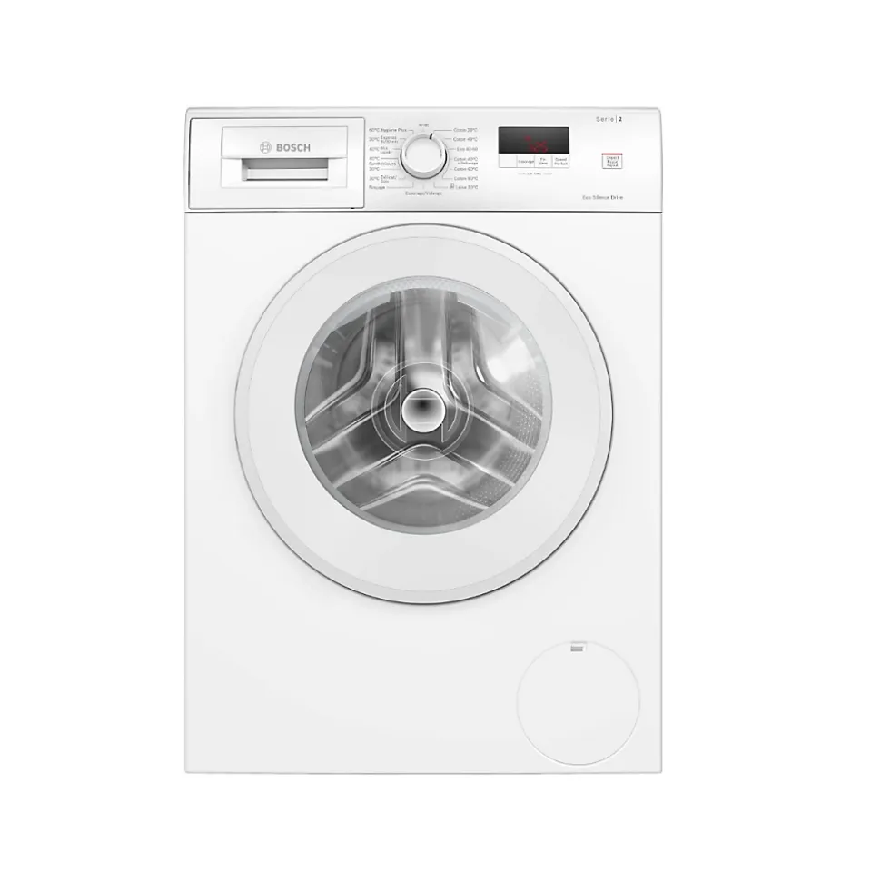 Lave-linge frontal 7 kg 1200 tours/min Bosch – Optez pour ce lave-linge WGE02201FR de Bosch confortable, silencieux et efficace avec EcoSilence Drive et ActiveWater Plus. Classe énergétique A : le meilleur standard en termes d’économie d’énergie. ActiveWater Plus : détection automatique de la charge pour mieux maîtriser la consommation d’eau. Speed Perfect : un linge parfaitement propre avec des cycles jusqu’à 65 % moins longs. Fonction Rajout de linge : un vêtement à ajouter en cours de cycle ? La machine fait une pause pour vous. Moteur Eco Silence Drive™ : un moteur silencieux et économe en énergie garanti 10 ans. – Type de produit : Lave-linge hublot.Type de construction : Pose-libre.Classe d’efficacité énergétique : A.Consommation énergétique pondérée en kWh pour 100 cycles de lavage Eco 40-60 : 40 kWh.Capacité maximale : 7.0 kg.Consommation d’eau du programme Eco 40-60 : 44 l.Durée du programme Eco 40-60 en heures et en minutes à la capacité nominale : 2:55 h.Classe d’efficacité d’essorage du programme Eco 40-60 : B.Classe de niveau sonore : A.Niveau sonore : 71 dB(A) re 1 pW.Vitesse d’essorage : 1200 tr/min.Indice de réparabilité : 8.5.Volume du tambour : 65 l.Hauteur avec top : -2 mm.Programmes standard : Coton, Synthétiques, Délicat/soie, Laine/lavage à la main.Programmes : Coton 20°C, Coton 40°C, Coton 60°C, Coton 90°C, Synthétiques 30°C, Synthétiques 40°C, Essorage/Vidange, Mix rapide, Express 15/30 min, Délicat/Soie, Laine/Lavage main.Options : SpeedPerfect.Options (touches) : Fin dans, SpeedPerfect, Départ/Pause/Rajout de linge, Vitesse d’essorage/Arrêt cuve pleine.Fonction Rajout.Ecran indiquant déroulement du cycle, vitesse d’essorage, temps restant, fin différée 24 h et recommandation de charge.Compteur de cycles.EcoSilence Drive : moteur induction.ActiveWater Plus.Protection anti-débordement.Design AntiVibration : Stabilité et