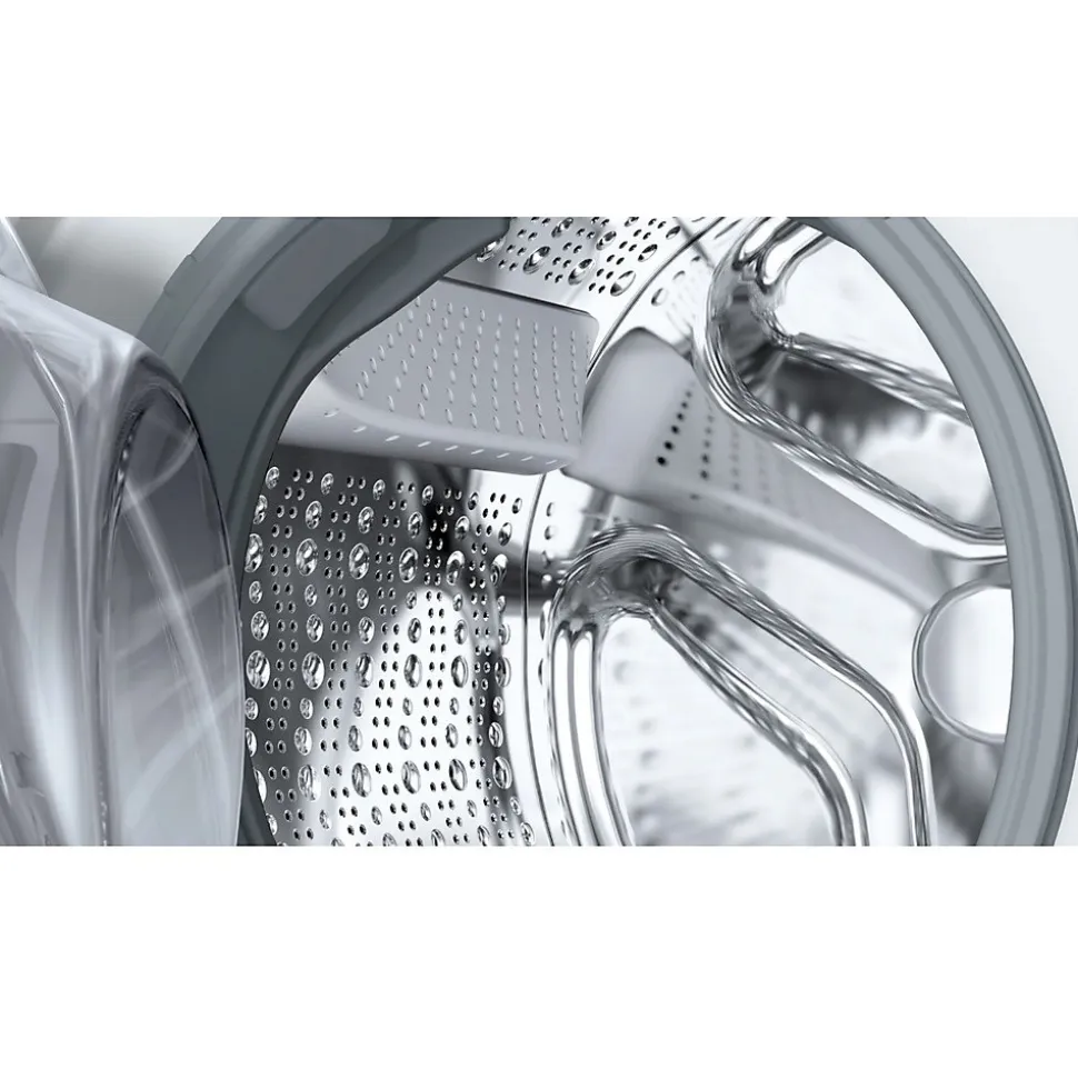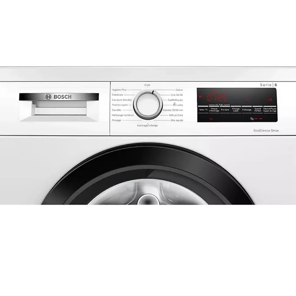 Lave-linge frontal 8kg 1400 tours/min Bosch – Lave-linge hublot Série 6 Bosch WUU28T18FR avec couvercle amovible – facilite l’encastrement- et moteur EcoSilence Drive™ : silence et robustesse garantis. Hauteur sans le couvercle : 82 cm. Moteur EcoSilence Drive™ : un moteur silencieux et économe en énergie garanti 10 ans. SpeedPerfect : un linge parfaitement propre avec des cycles jusqu’à 65 % moins longs. Hygiène Plus : lavage hygiénique éliminant les germes avec efficacité, même à 40°C. Tambour VarioDrum : soin des textiles garanti grâce à la structure unique du tambour. ActiveWater™Plus : la précision Bosch pour ne consommer que le strict minimum d’eau, adapté à la charge de linge. – Type de construction : Pose libre.Cet appareil est-il destiné à être encastré ? : Non.Type de commande : Electronique.Type de montage : Encastrable.Types de dispositifs de réglage et d’alarme : Affichage 7 segments, LCD, touche.Top amovible : Oui.Couvercle/Double porte : Non applicable.Niveau à bulle : Verre.Type de chargement : Chargement frontal.Charnière de la porte : À gauche.Couleur principale du produit : Blanc.Couleur de base du produit : Blanc.Roulettes : Non.Conçu(e) pour la libération d’ions argent (UE 2017/1369) : Non.Classe d’efficacité énergétique (UE 2017/1369) : A.Indice d’efficacité énergétique du cycle de lavage (UE 2017/1369) : 50.7.Consommation énergétique en kWh par kg par cycle du programme Eco 40-60 (UE 2017/1369) : 0.461 kWh/cycle.Température max. à l’intérieur du linge pendant le programme Eco 40-60 à mi-capacité (UE 2017/1369) : 27 °C.Température max. à l’intérieur du linge pendant le programme Eco 40-60 à un quart de la capacité (UE 2017/1369) : 23 °C.Température max. à l’intérieur du linge pendant le programme Eco 40-60 à la capacité nominale (UE 2017/1369) : 37 °C.Taux d’humidité résiduelle à la fin du programme Eco 40-60 à mi-capacité (UE 2017/1369) :