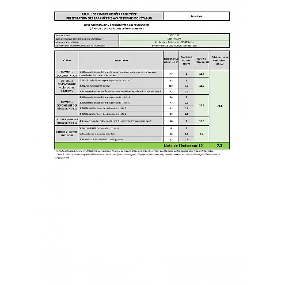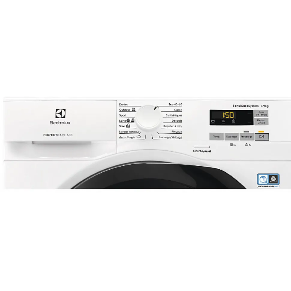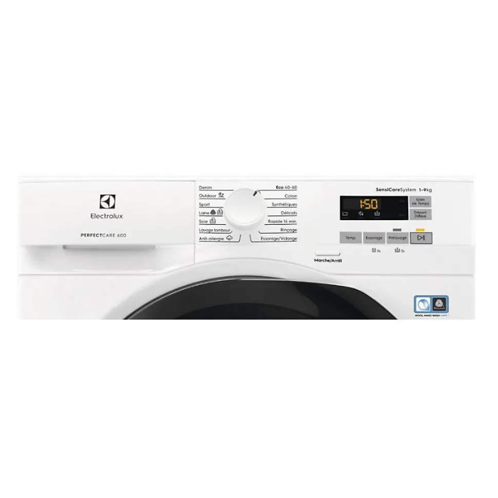 Lave-linge frontal 9kg 1400 tours/min Electrolux – Lave-linge hublot PerfectCare 600 Electrolux EW6F1495FC pour laver avec soin votre linge au quotidien. Le système SensiCare ajuste la durée du programme en fonction de la charge. Il utilise la quantité d’eau, la durée et l’énergie idéales pour offrir un maximum de soin à vos vêtements qui garderont leur aspect neuf plus longtemps. Système SensiCare, des vêtements neufs deux fois plus longtemps : Ce système ajuste automatiquement les réglages du cycle de lavage à la charge dans le tambour afin d’éviter que vos vêtements ne soient lavés trop longtemps. Ainsi, ils conservent leur aspect et leur texture lavage après lavage. Lavez plus vite avec l’option Gain de temps : Cette option vous permet de réduire la durée du cycle de lavage pour du linge légèrement sale ou à rafraîchir. Vos cotons et synthétiques sont traités de la même manière, mais deux fois plus vite! Une lessive qui est propre quand vous le décidez : N’organisez plus votre journée en fonction de votre lessive. Avec la fonction Départ différé, vous pouvez reporter le début du prochain cycle de sorte qu’il sera prêt quand vous l’êtes. Aucun nettoyage de filtre nécessaire : Le système AutoClean filtre les particules provenant des cycles de lavage, ainsi vous n’aurez plus à nettoyer il le fait lui même. Les petits objets restant dans vos poches sont récupérés dans le double joint du hublot. Chargement et déchargement de votre linge facilités : Ce lave-linge de grande capacité dispose d’une ouverture extra large rendant son chargement et son déchargement bien plus pratiques, même pour les articles les plus encombrants, comme des duvets. – Type de produit : Lave-linge frontal.Gamme : PerfectCare 600.Fonction séchage : Non.Encastrable : Non.Type de chargement : Frontal.Capacité nominale programme Eco 40-60 (kg) : 9.IEE : 68.8.Classe d’efficacité énergétique : C.Indice d’efficacité de lavage : 1.031.Efficacité de