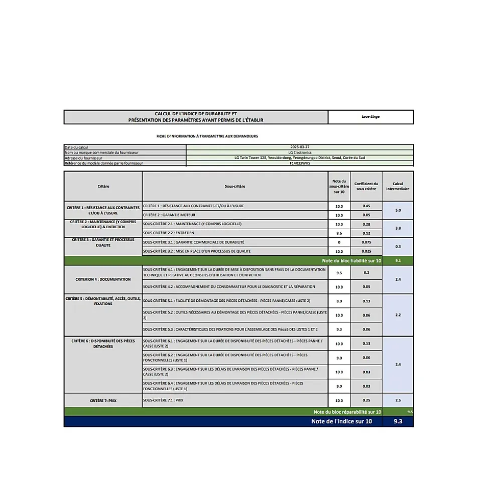 Affichage du temps restant : OuiAutre(s) : Mouvements de tambour 6 Motion, Pieds réglables, Vapeur anti-allergie SteamCapacité : 10 kgCapacité nominale programme Eco 40-60 (kg) : 10Classe d’efficacité d’essorage : AClasse d’efficacité énergétique : AClasse d’émission de bruit (en essorage) : AClasse d’émission de bruit acoustique dans l’air : AConso. d’eau pondérée par cycle (litres) : 52Conso. d’énergie cycle lavage »Eco 40-60 » (kWh) : 0.462Conso. d’énergie pondérée pour 100 cycles (kWh) : 47Conso. énergie /100 cycles (kWh) : 47Coton : OuiCouette / Duvet : OuiCouleur : BlancDémarrage différé (W) : 4.00Départ différé : NonDépart ou fin différé(e) : Fin différéeDimensions (cm) : 60 x 85 x 62Durée cycle »Eco 40-60 » (h:min) : 3:59Durée du programme »Eco 40-60 » capacité nominale (h:min) : 3:59Durée du programme »Eco 40-60 » moitié (h:min) : 3:00Durée du programme »Eco 40-60 » quart (h:min) : 2:22Eco 40-60° : OuiEcran : OuiEfficacité de rinçage (g/kg) : 5.0Emissions de bruit acoustique dans l’air (dB(A)) : 71Encastrable : NonFin différée : OuiFinition / Nuance : LaquéFonction séchage : NonHauteur (cm) : 85IEE : 46.8Indice d’efficacité de lavage : 1.031Indice de réparabilité (Note /10) : 8.6Largeur (cm) : 60Lave-linge connecté : OuiMatériau / type tambour : Acier inoxydableMode arrêt (W) : 0.50Mode veille (W) : 0.50Niveau sonore lavage (dB) : N/CNiveau sonore max.(dB) : 71Optimisation du lavage / rinçage : OuiPoids (kg) : 70Profondeur (cm) : 62Profondeur hors porte (cm) : 56.5Programmateur électronique : OuiProgrammes spéciaux : AI Wash, Mix 40°C, Anti-allergie, Délicat, Rapide coton, Textiles sport, Rapide 14, Couette, Rinçage+Essorage, Nettoyage de la cuve, Essorage seulSécurité enfant : OuiSynthétiques : OuiTaux d’humidité résiduelle pondéré (%) : 44.9Temp. max. (°C) à l’intérieur du textile traité (capacité nominale) : 32Temp. max. (°C) à l’intérieur du textile traité (moitié) : 29Temp. max. (°C) à l’intérieur du textile traité (quart) : 25Type : Lave-linge fr