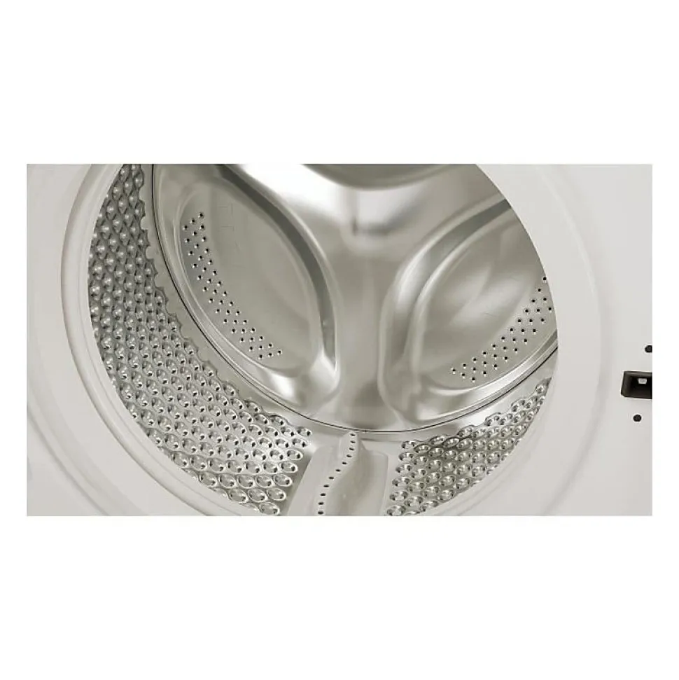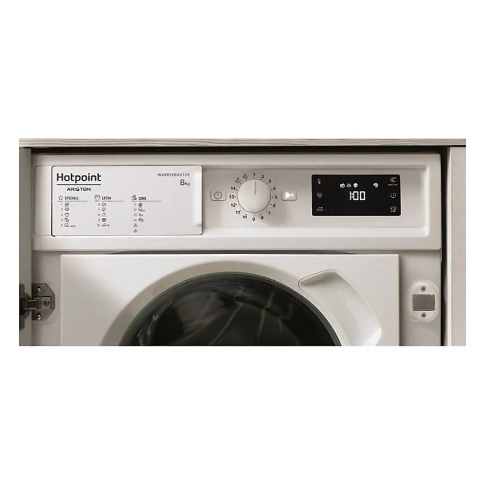 Lave-linge encastrable Hotpoint 8 kg, 1400 tr/min, classe énergétique B, 16 programmes (dont Anti-tache 100), tambour inox 58 L, grand hublot Ø340 mm, moteur induction silencieux, départ différé et affichage Big Digit.