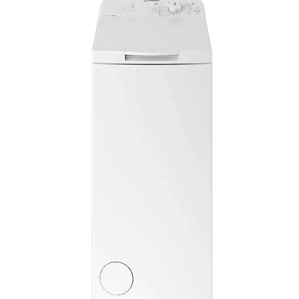 Lave-linge top 6kg 1000 tours/min Indesit – Lave-linge Top Indesit BTWL60400EUN idéale pour les petits espaces. TURN&GO : La simplicité. Un seul tour suffit pour démarrer votre programme quotidien Mix 30° en seulement 45min ! RAPIDWASH : La rapidité. Les 5 premiers programmes quotidiens durent moins d’1 heure ! Et si votre linge est vraiment très sale, sélectionnez l’option Lavage Intense afin d’accroître la durée du cycle et d’éliminer les taches les plus tenaces. Une simplicité d’utilisation : Le bac à lessive amovible et l’accès direct à la pompe à vidange permet un nettoyage facile des résidus lessiviels et du filtre. – Type de produit : Lave-linge Top.Fonction séchage : Non.Type de chargement : Top.Capacité nominale programme Eco 40-60 (kg) : 6.IEE : 69.Classe d’efficacité énergétique : C.Indice d’efficacité de lavage : 1.031.Efficacité de rinçage (g/kg) : 4.9.Conso. d’énergie pondérée pour 100 cycles (kWh) : 56.Conso. d’énergie cycle lavage »Eco 40-60 » (kWh) : 0.559.Conso. d’eau pondérée par cycle (litres) : 43.Temp. max. (°C) à l’intérieur du textile traité (capacité nominale) : 41.Temp. max. (°C) à l’intérieur du textile traité (moitié) : 32.Temp. max. (°C) à l’intérieur du textile traité (quart) : 23.Taux d’humidité résiduelle pondéré (%) : 62.Vitesse d’essorage (t/min) : 1000.Classe d’efficacité d’essorage : C.Durée du programme »Eco 40-60 » capacité nominale (h:min) : 3:15.Durée du programme »Eco 40-60 » moitié (h:min) : 2:35.Durée du programme »Eco 40-60 » quart (h:min) : 2:20.Emissions de bruit acoustique dans l’air (dB(A)) : 78.Classe d’émission de bruit acoustique dans l’air : C.Mode arrêt (W) : 0.11.Mode veille (W) : 0.11.Démarrage différé (W) : 4.Type de construction : Pose libre.Indice de réparabilité (Note /10) : 7.Volume tambour (L) : 42.Lave-linge connecté : Non.Programmateur électronique :