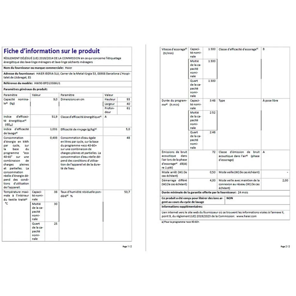 Lave-linge top Haier HW90-BPD13386U-SCaracteristiques principales : Classe énergétique : A.Consommation d’énergie sur 100 cycles – lavage : 49 kWh.Capacité de lavage : 9 kg.Durée du programme éco – lavage : 228 min.Consommation d’eau par cycle : 48 l.Qualité d’essorage : B.Niveau sonore : 72 dB.Fonctionnalités de l’appareil : Affichage du temps restant, Départ différé.Type de pose : Pose libre.Vitesse d’essorage (tours/min) : 1300 tr/min.Dosage automatique : Oui.Connecté : Oui.Délai(s) de départ différé : 1-24 h.Bandeau de commande : Bandeau électronique tactile.Programme de lavage : Coton, Eco 40-60,Rapide,Auto, Délicats, Rinçage + Essorage, Laine, Synthétiques et Coton 20°C.Type de moteur : Moteur Inverter.Avantages produits : Dosage automatique.Caractéristiques complémentaires : Fonction vapeur .Garantie d’origine : 2 ans.Couleur : Blanc.Poids : 59 kg.Sécurité : Sécurité de la porte et verrouillage des commandes.Hauteur : 93 cm.Profondeur du produit : 62 cm.Largeur : 40 cm.Catégorie de niveau sonore : A.Consommation d’eau sur 1 cycle éco – lavage : 48 L.Coût estimé d’utilisation sur 100 cycles : 32 Euros.Indice de réparabilité : 8,9 /10.Pays de fabrication : Chine.Origine de fabrication : Fabriqué hors Europe.Disponibilité des pièces détachées : 14 ans.Points forts : Capacité 9 kg (4 personnes) – Tambour 54.5 L.Essorage variable jusqu’à 1300 tours/min – 72 db.L x H x P : 40 x 93 x 62 cm.Dosage automatique – Classe A – Connectivité Wifi + Bluetooth.Caracteristiques principales :