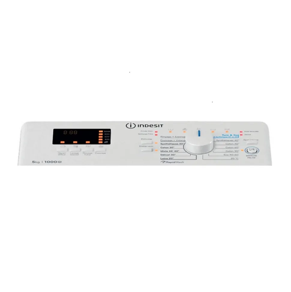 Lave-linge top 5kg 1000 tours/min Indesit – Lave-linge top BTWS50400FR de la marque Indesit.Turn&go : La simplicité.Un seul tour suffit pour démarrer votre programme quotidien Mix 30° en seulement 45min !Rapidwash : La rapidité.Les 5 premiers programmes quotidiens durent moins d’1 heure ! Et si votre linge est vraiment très sale, sélectionnez l’option Lavage.Intense afin d’accroître la durée du cycle et d’éliminer les taches les plus tenacesUne simplicité d’utilisation :Le bac à lessive amovible et l’accès direct à la pompe à vidange permet un nettoyage facile des résidus lessiviels et du filtre. – Type de produit : Lave-linge top.Capacité de chargement (kg) : 5.Vitesse d’essorage (tours/min) : 1000.Tambour Inox : 42 L.Puissance de chauffage : 2100 W.Alimentation électrique : 220-230 V – 50 Hz.Fusible (en ampères) : 10.Capacité Variable Automatique : Oui.Indicateur de déroulement du cycle : Small Digit.Moteur : Universel.Classe d’efficacité énergétique : C.Consommation pondérée d’énergie (KWh / 100 cycles) : 52.Consommation d’eau programme Eco 40-60 (L /cycle) : 40.Classe d’efficacité d’essorage : C.Niveau d’émission sonore en essorage (dB) : 76.Classe sonore en essorage : B.Départ différé0-24h : Oui.Energy Saver : Oui.visuel non contractuel Prélavage : Oui.Lavage Intensif : Oui.Rinçage Extra : Oui.Essorage : Oui.Reset Vidange : Oui.Dimensions nettes en cm (HxLxP) : 90 x 40 x 60.Poids (en kg) net : 53.