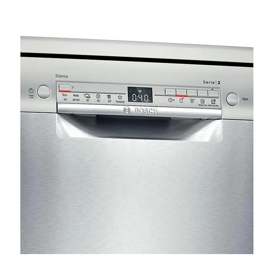 Lave-vaisselle Bosch SMS2HTI79E avec capacité 12 couverts, 6 programmes, technologie Home Connect, système de séchage par échangeur de chaleur, consommation économe, et design inox anti-trace.