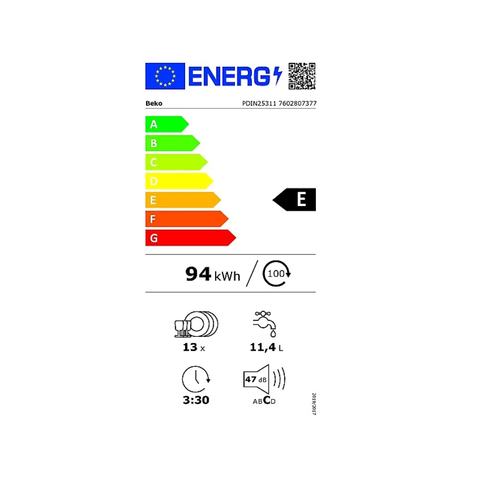 Lave-vaisselle 60cm 13 couverts 47db tout intégrable Beko – Lave-vaisselle PDIN25311 BEKO.Programme Quick&Shine : Lavez rapidement et efficacement.Le programme Quick & Shine vous garantit un lavage et un séchage parfait (classe A) en seulement 58 minutes. Le tout en consommant moins de 12 litres d’eau.Demi-charge : Optimisez vos consommations.L?option demi-charge permet d?optimiser vos consommations d?eau et d?électricité, lorsque vous avez peu de vaisselle à laver.LedSpot : Soyez averti du fonctionnement votre appareil.Ce modèle signale lorsqu?il est en fonctionnement grâce un témoin lumineux projeté sur le sol, afin d’éviter d?ouvrir le lave-vaisselle en cours de cycle.Panier à couverts coulissant : Profitez d’une flexibilité maximum.Pour une flexibilité maximale, le panier à couverts peut se déplacer de droite à gauche sur toute la largeur du panier inférieur. Vous pouvez ainsi placer des assiettes et des plats à votre convenance.Pieds arrières réglables depuis l’avant : Installez votre appareil avec simplicité.Ce lave-vaisselle intégrable est équipé d?un système de réglage des pieds arrières depuis l?avant de l?appareil. L?installation devient encore plus simple. – Type : Lave-vaisselle tout-intégrable.Construction : Tout intégrable.Nombre de couverts standard : 13.Classe énergétique : E.Classe d’efficacité de séchage : A.Niveau sonore (dB) : 47.Classe de niveau sonore : C.Conso. énergie /100 cycles (kWh) : 94.Conso. d’énergie /an (kWh) : 262.Conso. eau /cycle (L) : 11.4.Conso. d’eau annuelle (L/an) : 3192.Lave-vaisselle connecté : Non.Type de séchage : Par condensation.Programmateur électronique : Oui.Couleur : Tout intégrable.Nbre programmes : 5.Nbre températures : 4.Intensif : Oui.Eco : Oui.Programmes spéciaux : Clean&Shine, Quick&Shine 58′, Mini 30′.Départ différé : Oui.Type de départ différé : 3-6-9 h.Demi-charge : Oui.Tablettes tout en un