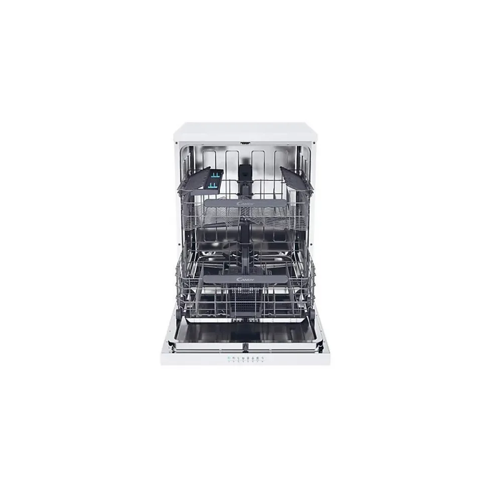 Lave-vaisselle 60cm 14 couverts 44db Candy – Lave-vaisselle Candy CF4E4F0W doté de 8 programmes dont WASH&DRY 35mn. Exclusivité Candy, ce programme est le plus rapide du marché avec un lavage et séchage de la vaisselle en seulement 35 min. Grâce à l’application hOn, accédez en wifi à des programmes additionnels, recevez des notifications en fin de cycle, bénéficiez de conseils pour entretenir votre lavevaisselle et bien plus encore ! Pratique, la porte de votre lave-vaisselle s’ouvre automatiquement à la fin du cycle permettant un séchage rapide et des économies d’énergie. Candy Rapido est équipé du nouveau moteur SpeedDrive Inverter, une nouvelle génération de moteur inverter sans balai permettant un lave plus silencieux, une économie d’énergie et une durabilité du produit. – Type de produit : Lave-vaisselle 60 cm.Nombre de couverts standard : 14.IEE : 55.9.Classe d’efficacité énergétique : E.Indice de performance de lavage : 1.121.Indice de performance de séchage : 1.061.Conso. d’énergie par cycle en programme éco (kWh) : 0.95.Conso. d’eau par cycle en programme éco (L) : 10.9.Conso. d’énergie pour 100 cycles (kWh) : 95.Durée du programme éco (h:min) : 3:54.Emissions acoustiques dans l’air dB(A) re 1 pW : 44.Classe d’émission de bruit acoustique dans l’air : C.Mode arrêt (W) : 0.50.Mode veille (W) : 1.00.Démarrage différé (W) : 4.00.Mode veille avec maintien de la connexion au réseau (W) : 2.00.Type de construction : Pose libre.Lave-vaisselle connecté : Oui.Type de connectivité : Wi-Fi + Bluetooth.Type de séchage : Ouverture de porte automatique.Couleur : Blanc.Nbre de programmes : 8.Nbre températures : 5.Prélavage : Oui.Intensif : Oui.Eco : Oui.Programmes spéciaux : Universel, Rapide 35 min, Rapide 59 min, Verre, Lavage auto, 20 programme supplémentaires.Départ différé : Oui.Type de départ différé : 1-23 h.Touches